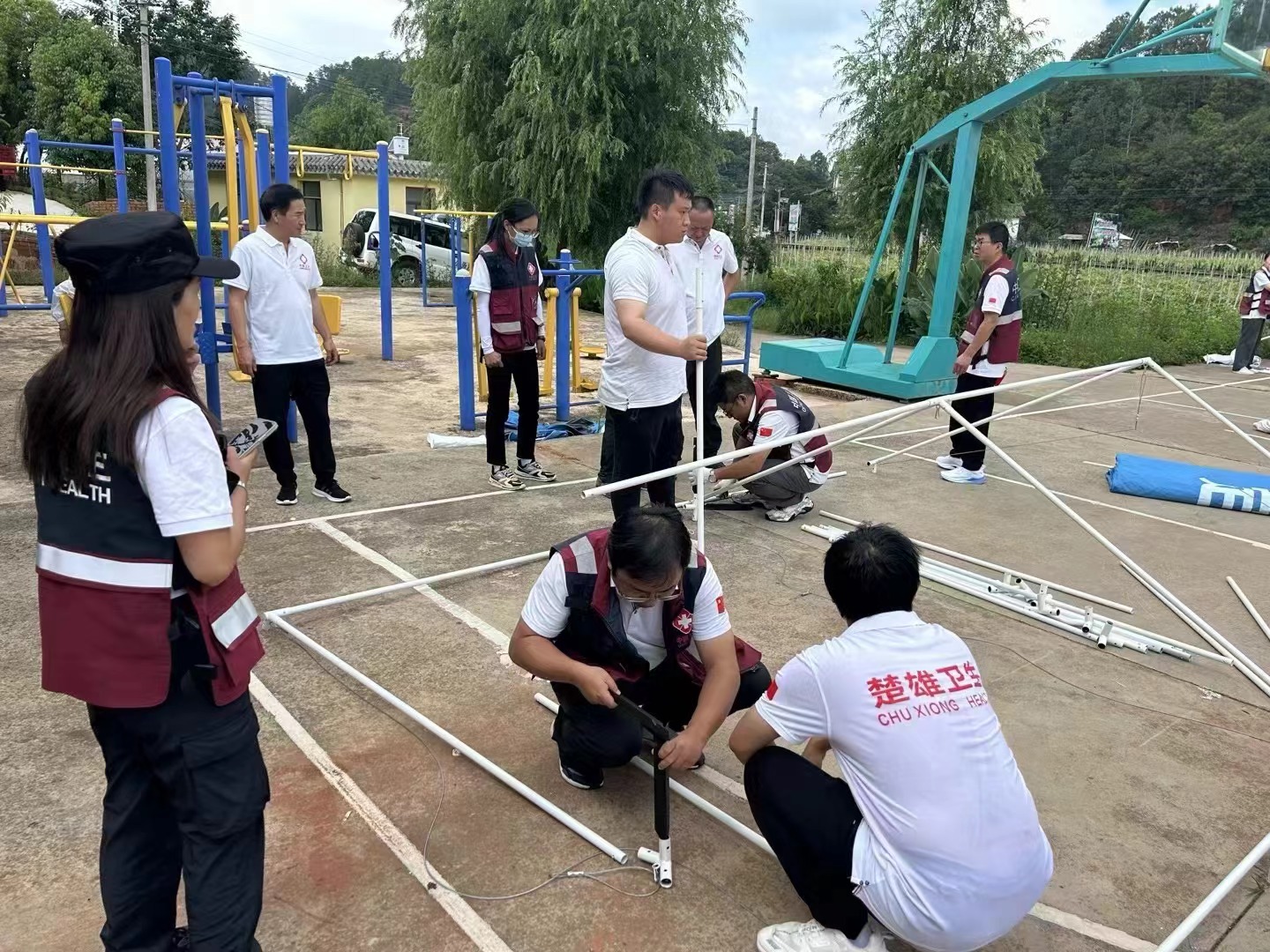 本次演练模拟我镇某村发生6.3级地震,震源深度10千米。震后造成人员伤亡和较大经济损失,震区道路部分受损,电力、供水、通信中断,部分重要基础设施损毁,次生灾害风险较高。演练现场主要采用模拟实景与实兵、实具、实械相结合的方式进行。随着演练指挥长一声令下,由综合协调组、医疗救援组、卫生防疫组、后勤保障组、宣传报道组等组成的卫生应急救援队,分成5个组,快速到达指定区域开展协同应急演练。