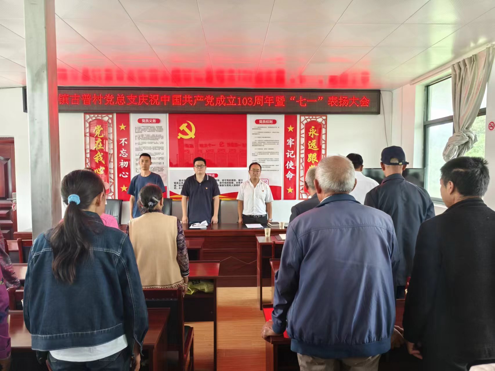 为庆祝中国共产党成立103周年,回顾党引领人民的辉煌历程,表扬在全村经济社会发展中作出了积极贡献的优秀共产党员,7月2日,插甸镇古普村党总支举行庆祝建党103周年暨“七一”表扬大会。会议由插甸镇古普村党总支书记丁亚能主持,县级挂包部门领导、插甸镇挂村领导、古普村全体党员、村“两委”班子成员及驻村工作队员80余人参加了会议。