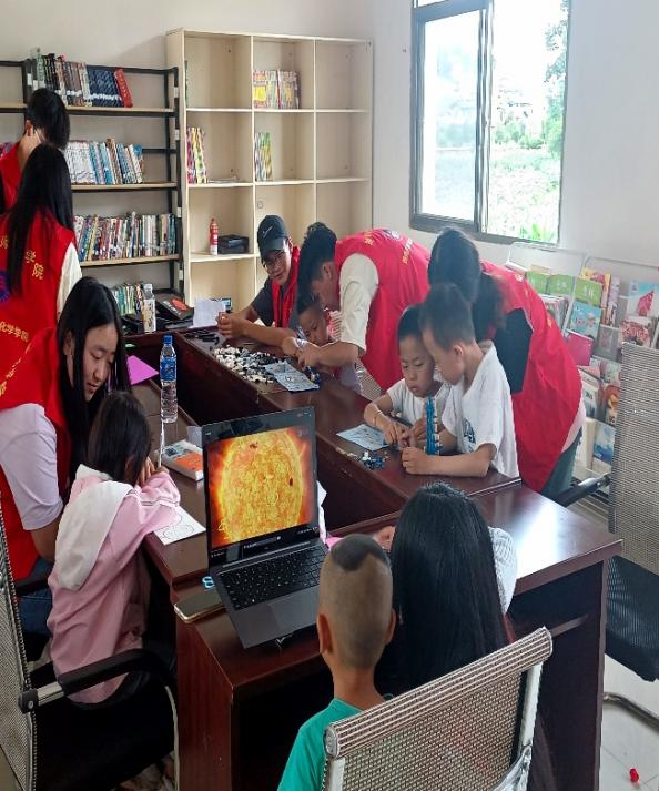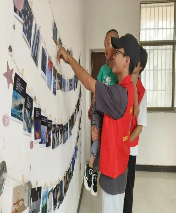 在前期工作准备就绪后,7月9日,实践团在高桥镇村委会如期开展了天文科普启蒙活动。团队成员向留守儿童生动幽默地讲述了基础的传统天文知识,带领他们观看了“八大天天”启蒙篇,绘画八大天天;介绍二十四节气,歌唱二十四节气歌;引领小朋友们用积木搭建空间站和火箭,制作简易天文望远镜和日晷,介绍了中国航天事业的发展历程;团队成员还设计构建了一个小型天文展览墙,带领小朋友们一起观览、了解中国天文发展与成就。
