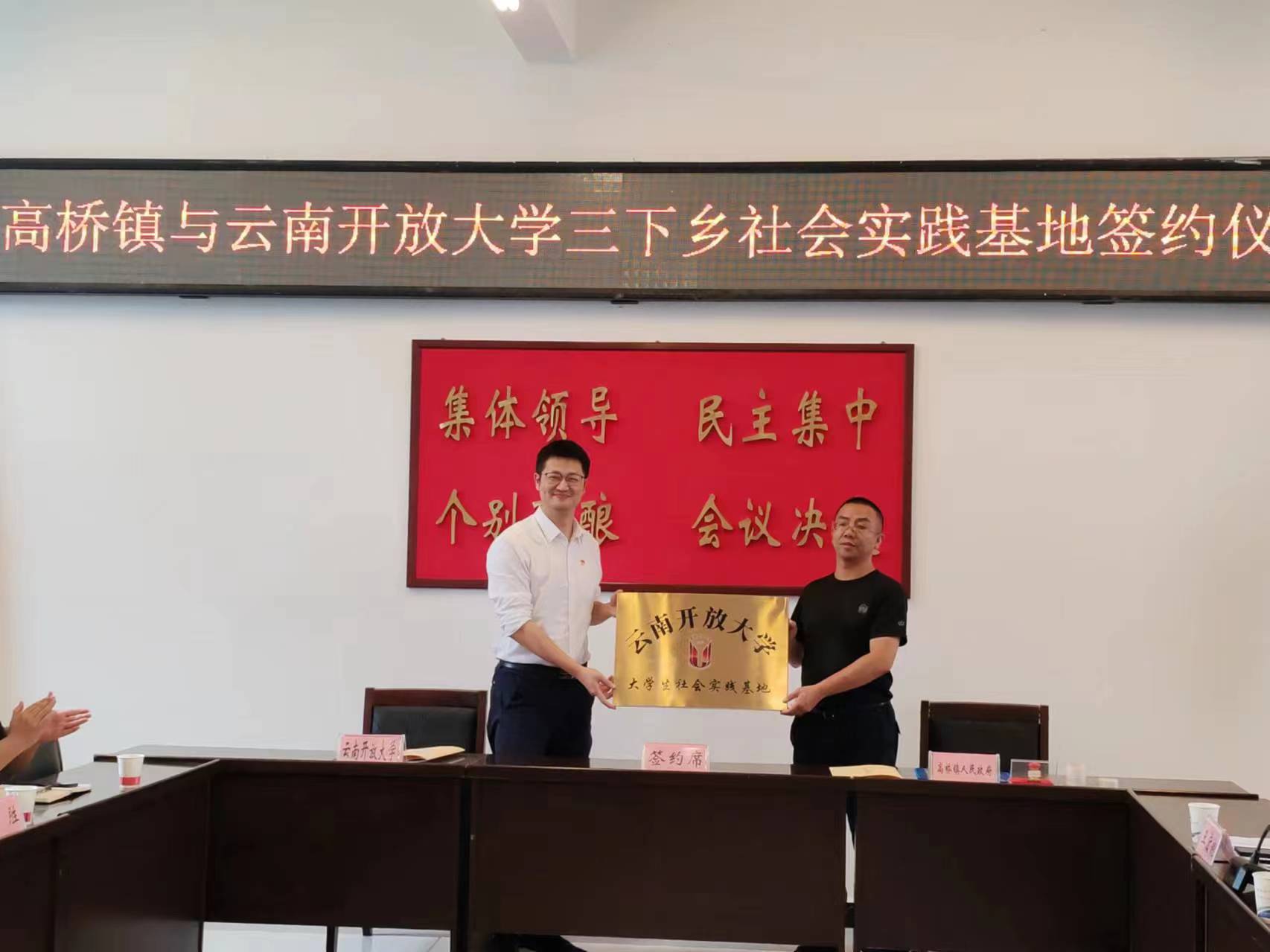 为深入学习贯彻习近平新时代中国特色社会主义思想和党的二十大精神,推进高校与乡镇广泛交往,全面交流,深度交融。组织青年大学生走进基层,在服务实践中成长成才。7月11日,高桥镇与云南开放大学举行大学生“三下乡”社会实践基地签约仪式,云南开放大学团委书记宋一鸣、校团委副书记徐胜、郭宁老师,共青团武定县委书记李俊材、镇组织委员钱碧琳参加,签约仪式由镇党委政法委员、副镇长王宏昶主持。
