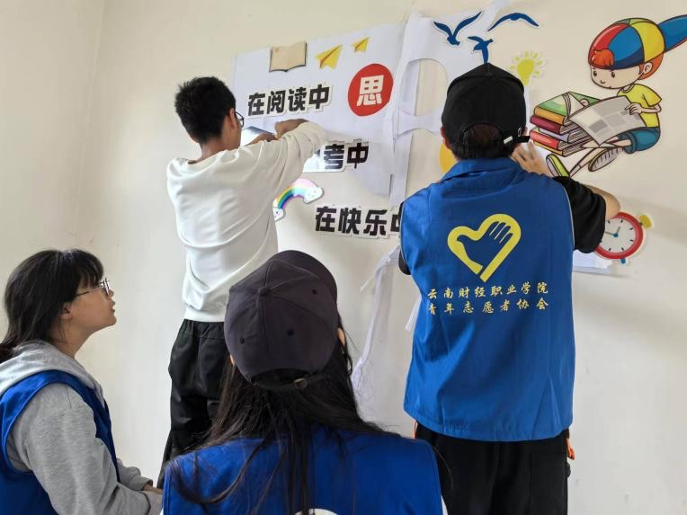 据悉,2023年7月,由云南财经职业学院筹建的公益书屋——“我们的书屋”在武定县高桥村委会揭牌落成。过去的这一年,“我们的书屋”深受高桥学生的喜欢,每逢周末、寒暑假,种类繁多的书籍吸引着一批又一批中小学生来借阅。今年,云南财经职业学院数字商学院“三下乡”社会实践团队带着更多的书籍来到高桥,为高桥的小朋友们打开更广阔的视野。高桥村委会为公益书屋提供了新场地,实践团队一同对书屋进行了打扫、墙绘装饰修整,并举行了捐募仪式。