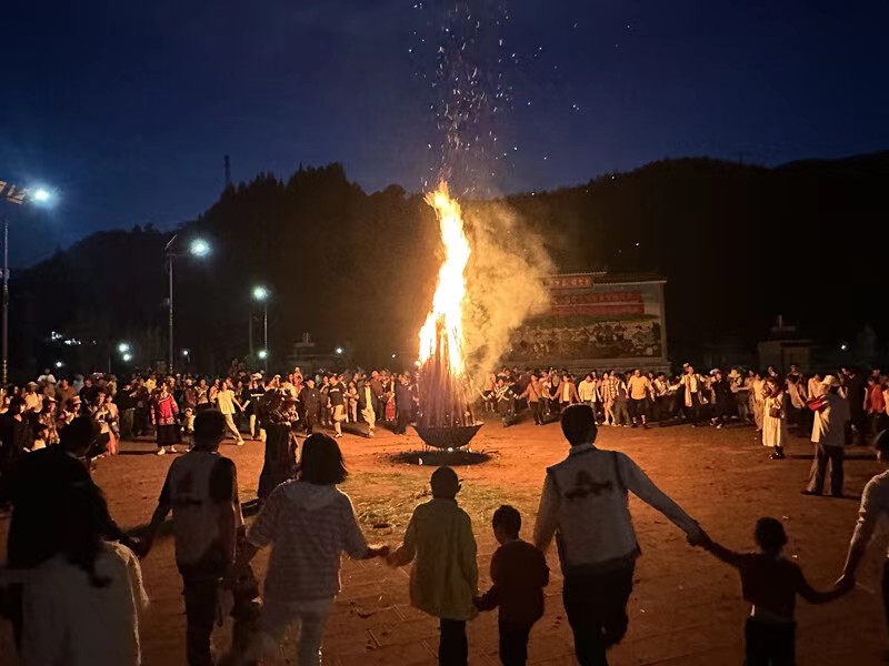 夜幕降临时,乡党政班子成员在环州民族团结广场上燃起熊熊的篝火,大家手拉手围成圈,随着清脆悦耳的小调,时而闪腰跌脚,时而拆步合脚,舞步整齐统一,跳出了环州人幸福美好的新生活。身着少数民族服饰、热情好客的环州人民拉着各族群众在篝火旁狂欢,尽情展现了环州乡民族团结融合、共享幸福生活的生动图景。