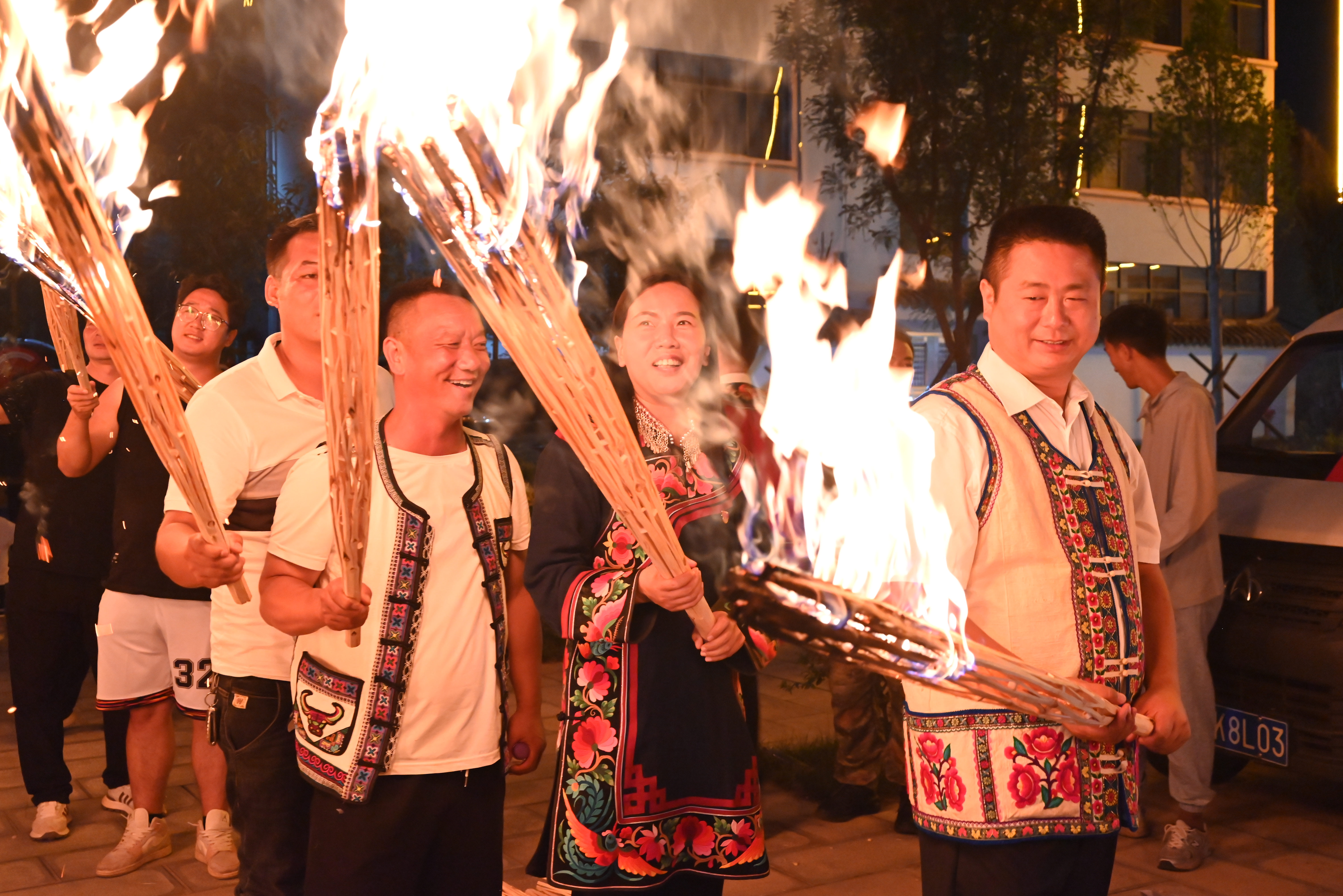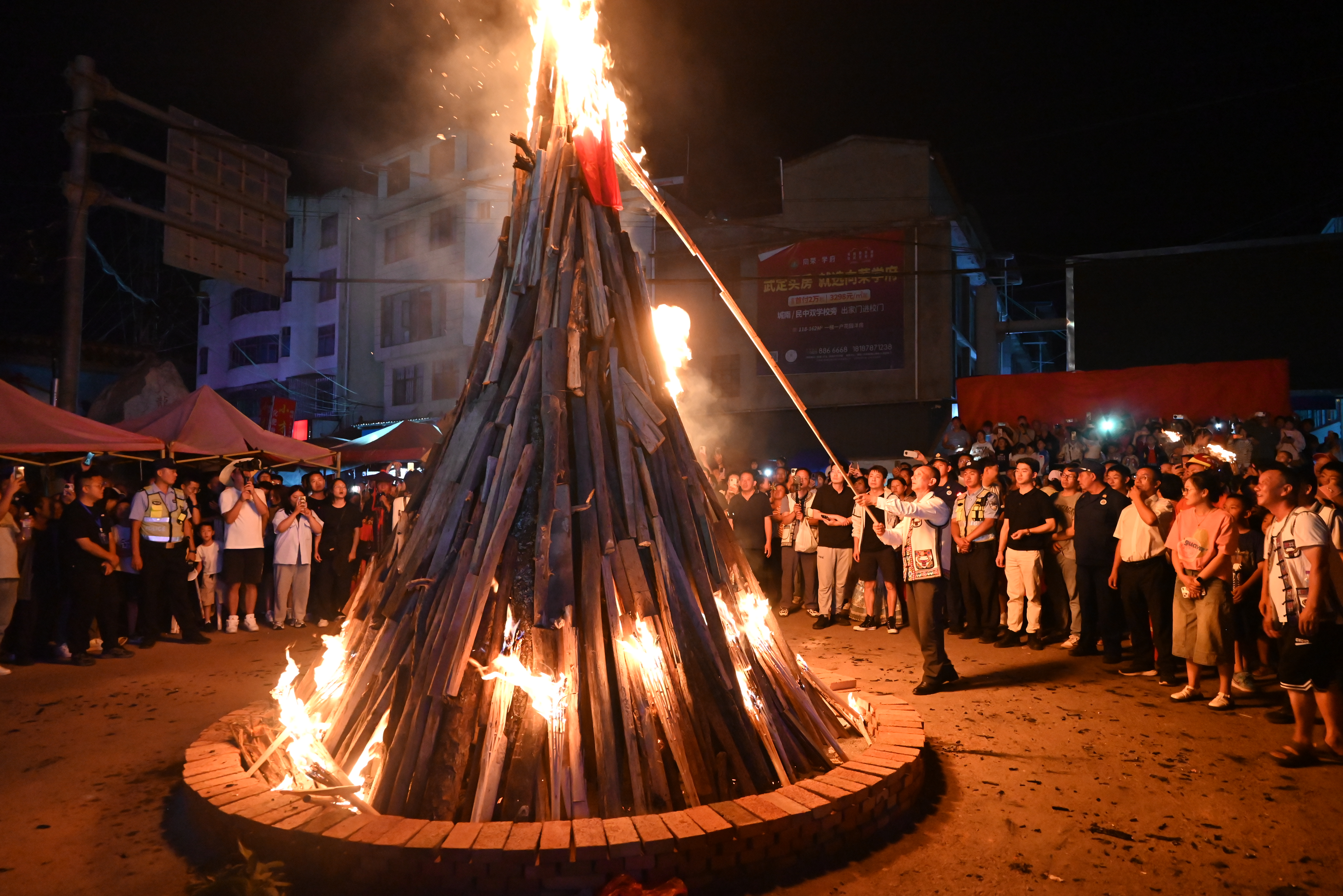 26日晚,人声鼎沸,在祭火大典现场,当地各族群众相聚共庆,前来观礼的人群跟随着毕摩手持火把,走过小巷、穿过马路、巡游集镇,一起为高桥驱邪祈福。主火场上群英荟萃、人潮涌动,随着火把越烧越旺,各族群众和彝家儿女一起,围着篝火,绽放激情。天空繁星点点,地上篝火熊熊,绚烂的星空下人影绰绰,舞姿翩跹,大家尽情徜徉在歌舞的海洋,忘返于高桥的仲夏不眠夜。