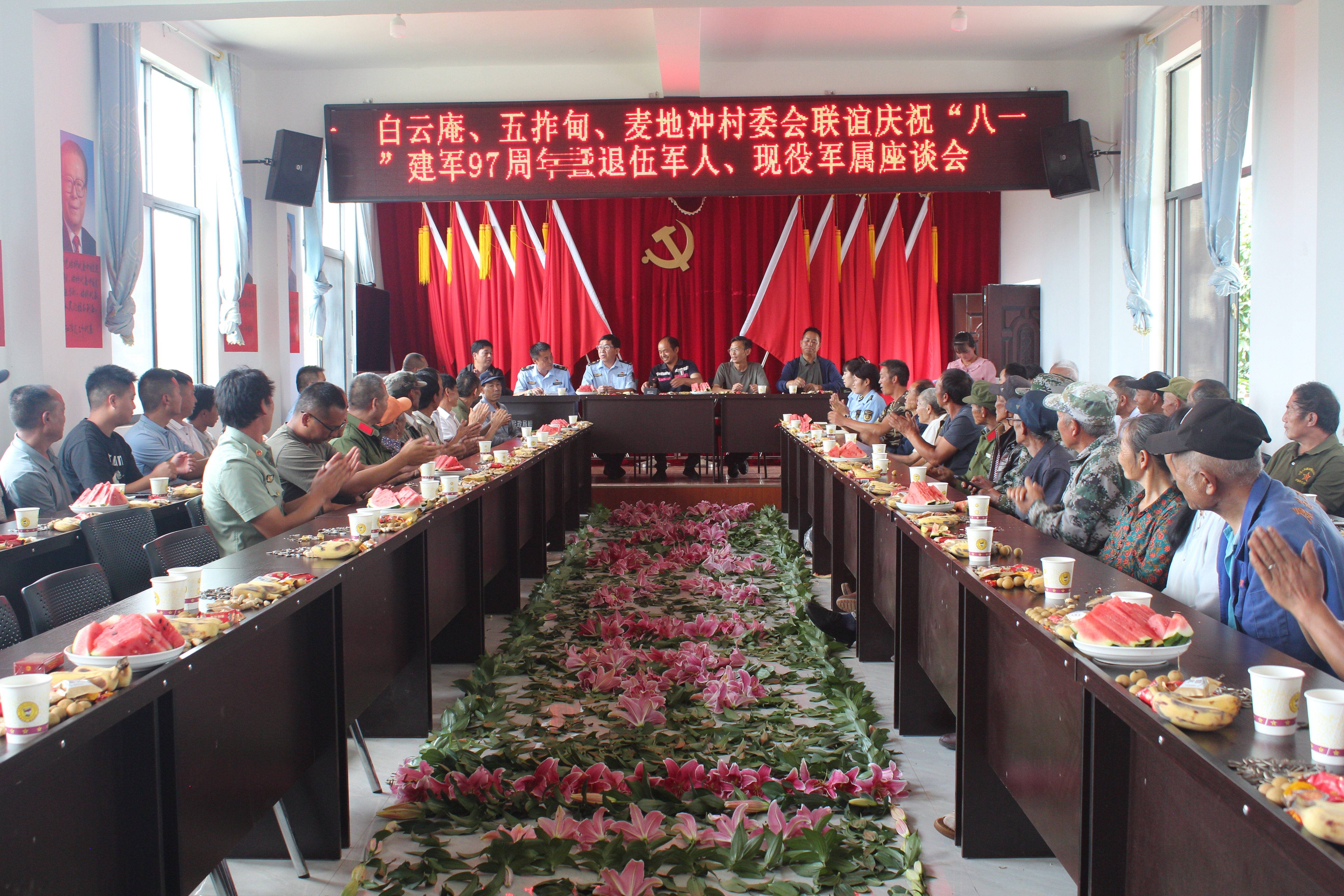 为庆祝中国人民解放军建军97周年,2024年8月1日,白云庵村党总支、五拃甸村党总支、麦地冲村党总支共同组织各村退伍军人、现役军属在白云庵村民委员会议室会召开庆祝中国人民解放军建军97周年座谈会暨退伍军人、现役军属座谈会。云南省交通运输执法局楚雄支队党委书记汪文、猫街镇人民政府副镇长、武装部部长莫琨、白云庵党总支书记朱建荣、五拃甸党总支书记章文达、麦地冲党总支书记李生光参加座谈会。会议由朱建荣主持。
