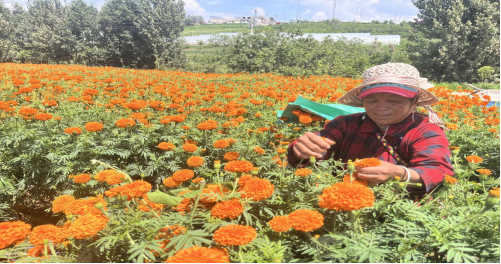 “万寿菊花期长,观赏价值高,每年这个时候,每天慕名前来赏花的游客络绎不绝。”金沙社区党总支书记韩剑说,“万寿菊产量高,每亩能产花3-5吨,今年我们种植了130亩,收益能达30万元以上。”