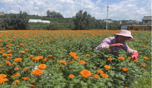 “每年的8-10月,我都到基地采摘万寿菊,每天能采摘300公斤,1公斤有0.3元,工作轻松还离家近,一举多得。”社区居民杨大妈愉快的说。颜色鲜艳的万寿不仅是美丽的风景,还铺就了增收致富的“黄金路”。金沙社区坚持“绿水青山就是金山银山”绿色生态发展道路,采取“公司+订单企业+合作社+基地+农户”的产业化发展思路,通过政策引导、政府推动、市场拉动、效益带动,形成了‘党总支牵头、合作社种植、公司收购、辖区居民务工’的利益机制,每年能吸收社区居民就近务工300余人次,增加居民收入2000元,实现农业产业经济效益和社会效益双向共赢。