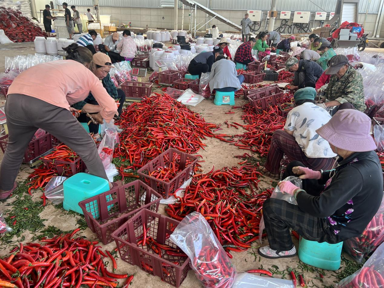 (图为就近就地务工的村民正在将辣椒分拣、装袋)