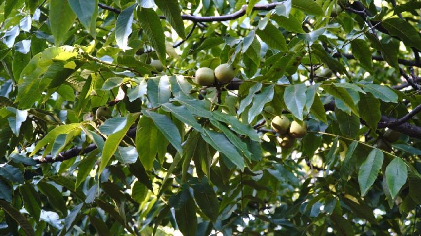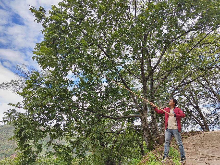 “咚咚咚.......”随着长竹竿晃动,一颗颗新鲜的核桃果落地,不一会就堆成小山。走进白路镇营盘村委会中沟村,一片片核桃林绿意盎然,三颗一枝,五颗一簇,核桃果挂满枝头,农户手持长竹竿忙着将核桃敲落枝头。