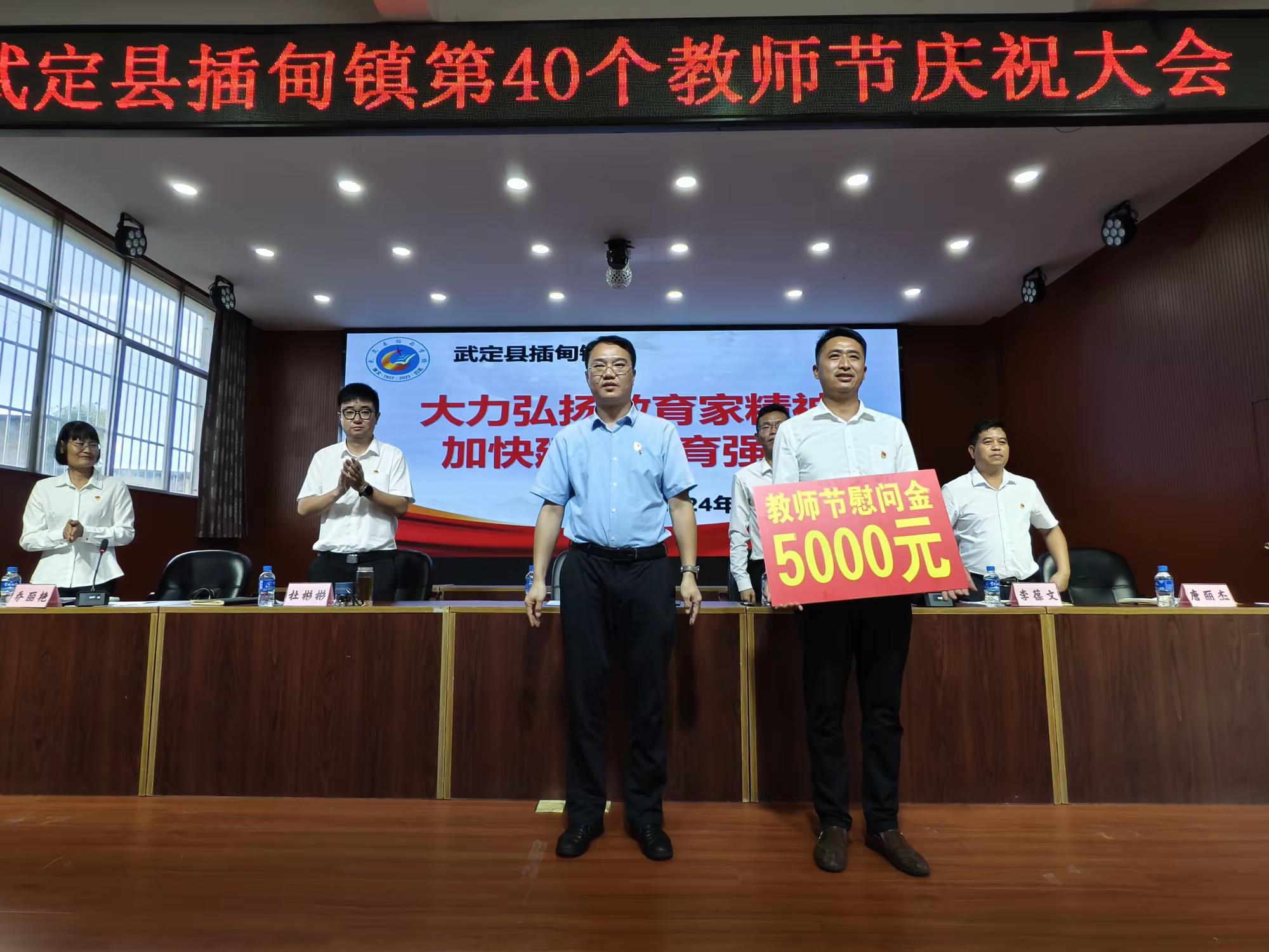 武定县委常委、县委组织部部长潘德志同志,武定县教育工委书记、县教体局党组书记、局长何毓才同志,插甸镇党委书记杜彬彬同志、镇人大主席李葆文同志,镇党政班子成员,各村党总支书记、驻村第一书记,镇属各办各中心负责人,中、小学教师代表及部分退休教师参加了本次教师节庆祝活动。