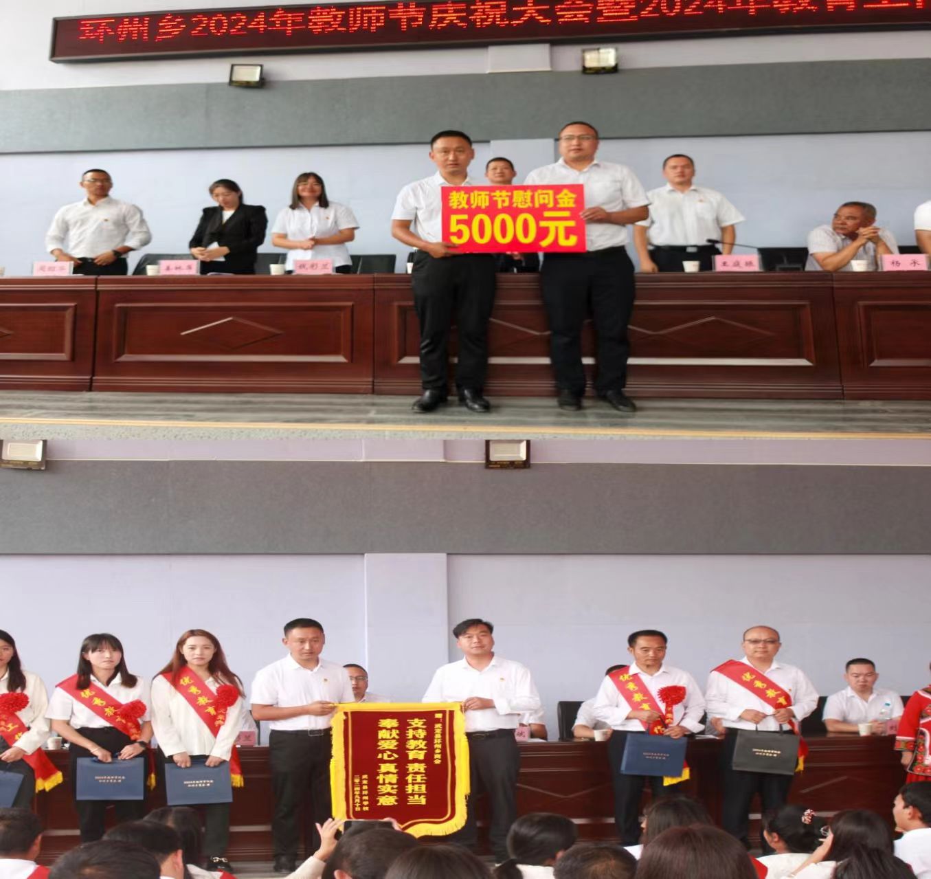 此外,大会还收到了一份来自教育体育局副局长万开洪转达县委、县人民政府对环州学校全体教职工教师节的慰问和祝福,同时,环州商会也给每位教师准备了一份纪念品。万副局长还对老师们在教育教学工作中取得的优异成绩给予了高度评价,并表达了对教师们的亲切关怀和节日祝福。这份来自上级部门的认可与鼓励,让在场的每一位教师都感受到了无比的温暖与自豪。