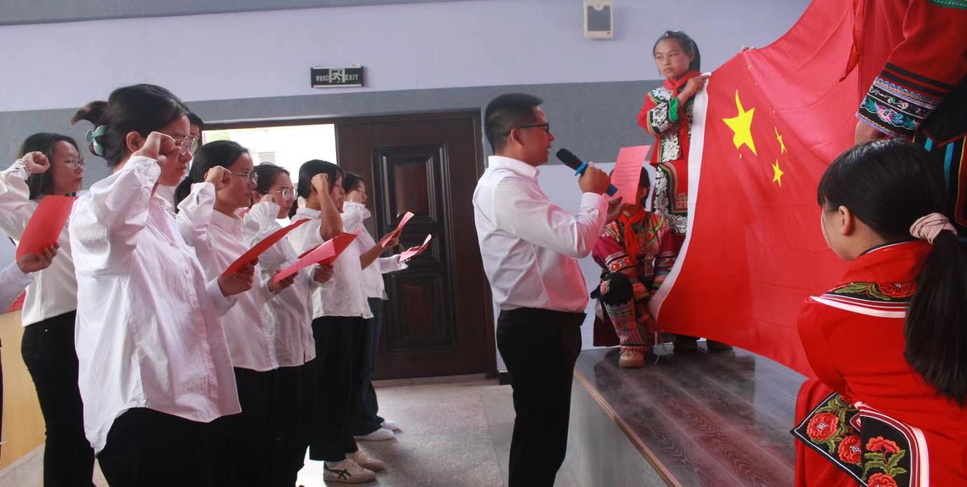 中学部教务主任太春杰带领全体新教师面对国旗宣誓。在铿锵有力的誓言中,全体新教师更加坚定了要做有理想信念、有道德情操、有扎实学识、有仁爱之心的“四有”好老师的决心与信念。宣誓仪式不仅是对教师职业精神的肯定,更是对教师职业操守的强化和提升。