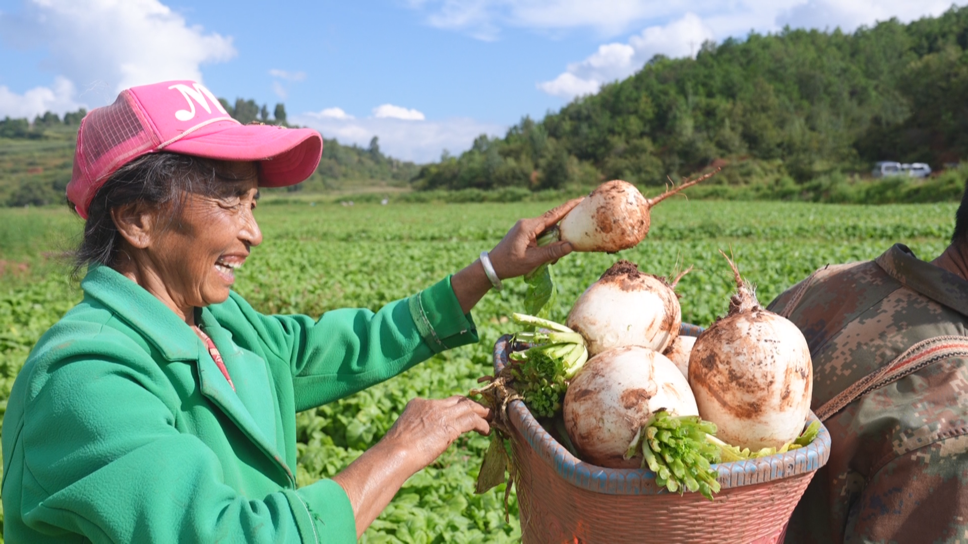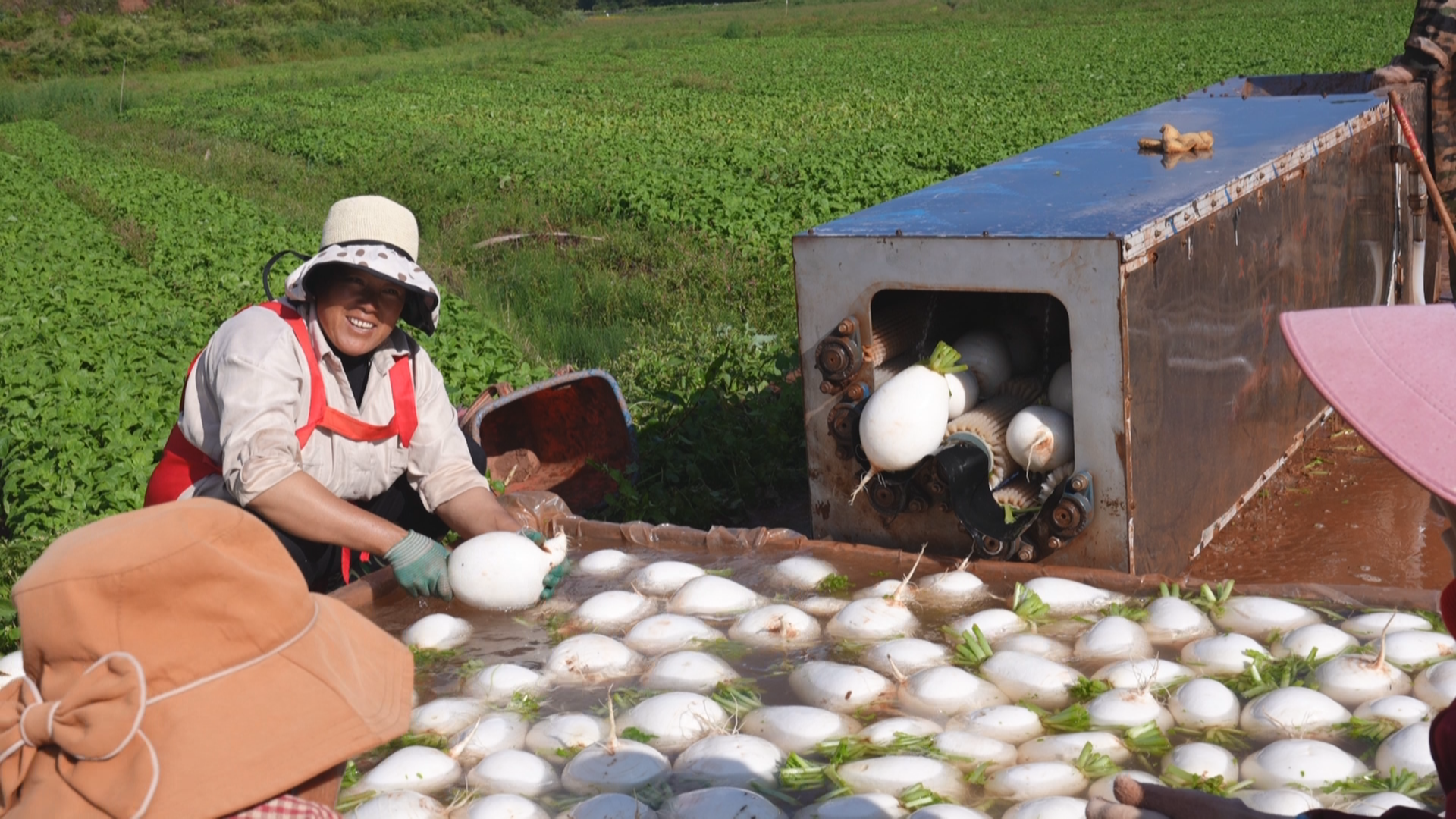 在插甸镇康照村七棵树至志老箐的高标准农田里, 连绵成片的萝卜进入了最佳采收期,村民们正在将一个个雪白的大萝卜集中清洗、打包装车,大家分工明确,配合默契,脸上洋溢着丰收的喜悦。