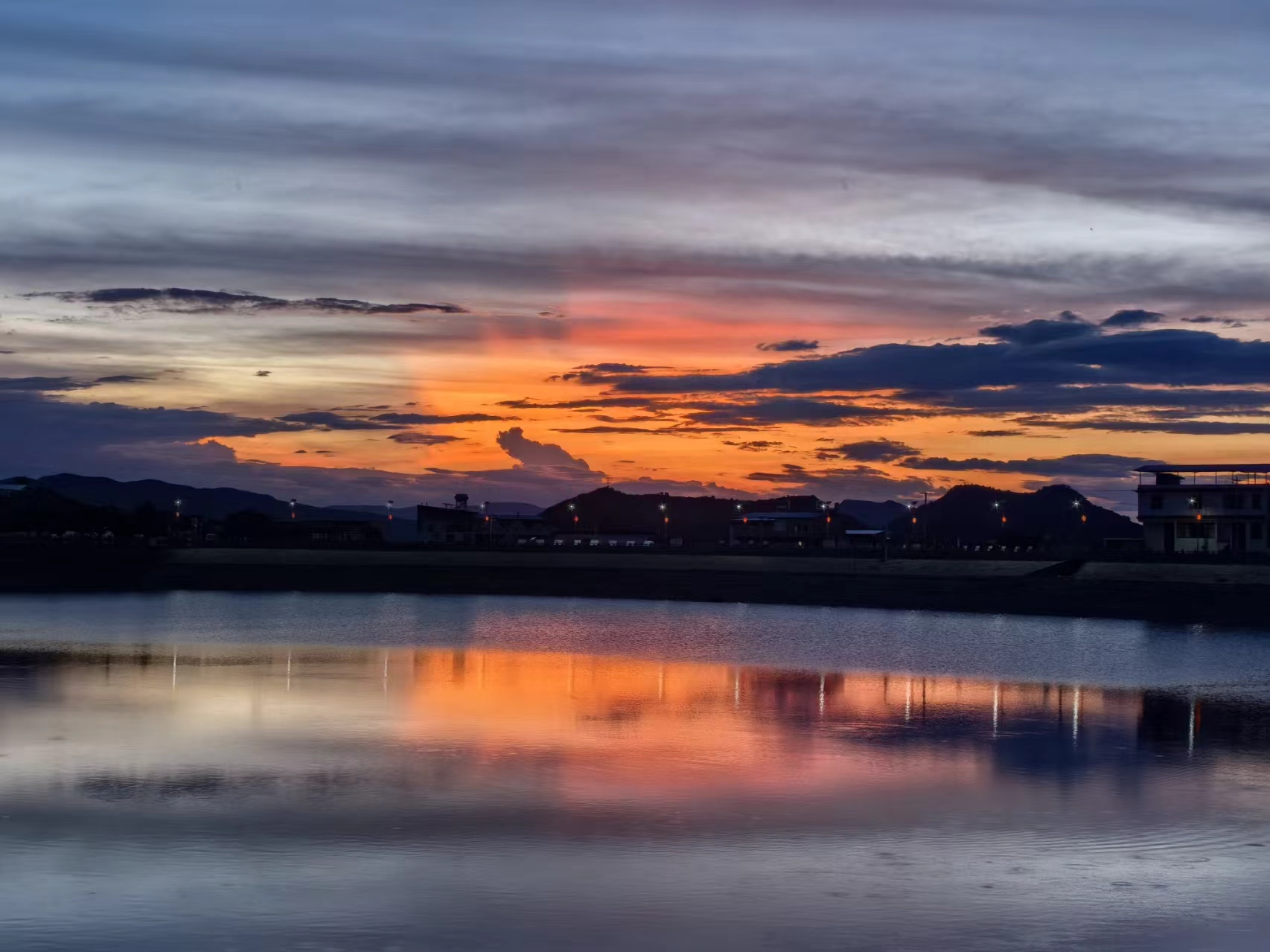 万德湖畔,晚霞的倒影在波光粼粼的水面上摇曳生姿。湖水仿佛变成了一条流动的彩绸,与天空中的绚丽遥相呼应。湖畔的树木、建筑也都沐浴在这如梦如幻的霞光之中,轮廓被勾勒得更加清晰而美丽,处处彰显着绿美万德的魅力。