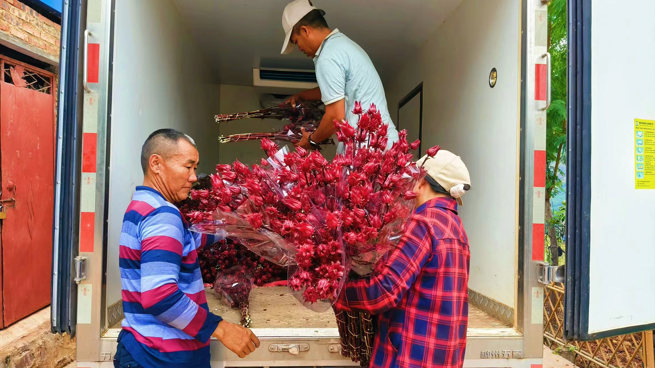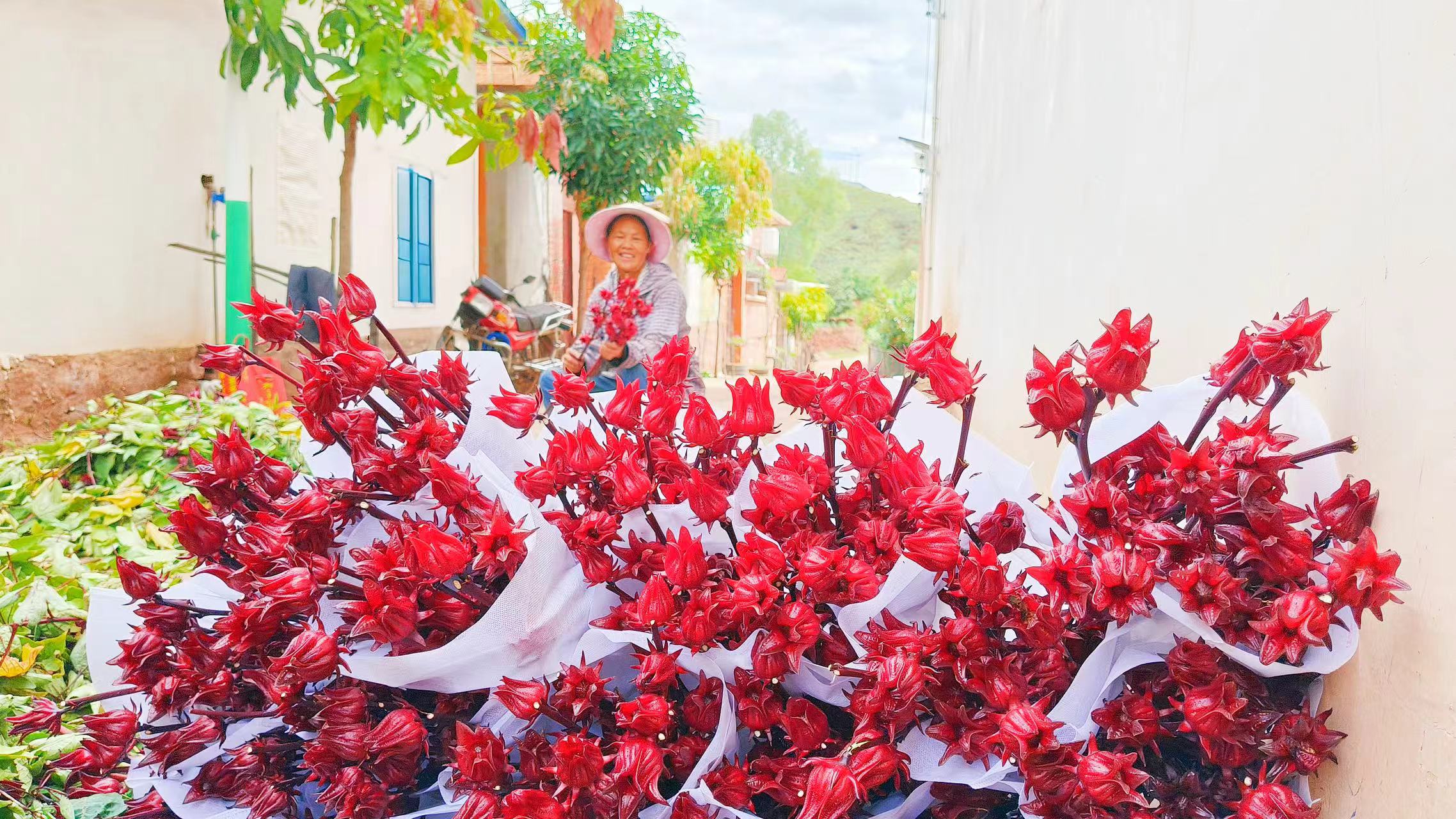 “我种植玫瑰茄已经好多年了,近两年市场需求量大,收入可以,比种其他的经济作物都要好。目前,我家的玫瑰茄是作为鲜切花出售,一把4块钱,一亩收入在5000块钱左右。我们包装好后,老板到村里收购拉到昆明斗南花卉市场出售,听说很抢手,很多主播抢着在抖音、淘宝上进行直播,老板下午6点到货,三四个小时就已经售空。我们包装后掉落的花朵可以以3元一公斤的价格进行出售,也可以晒干作为药材,以70元一公斤的价格出售,反正,玫瑰茄从鲜切花到晒干怎么都好卖。”二台坡村长李华林笑着说。据了解,今年,李华林家里种植了15亩左右的玫瑰茄,预计产值8万元。眼下,他和家人每天都忙着采摘包装玫瑰茄,丰收的喜悦溢于言表。