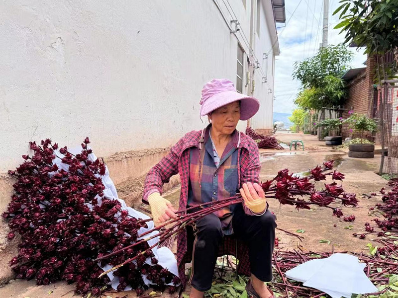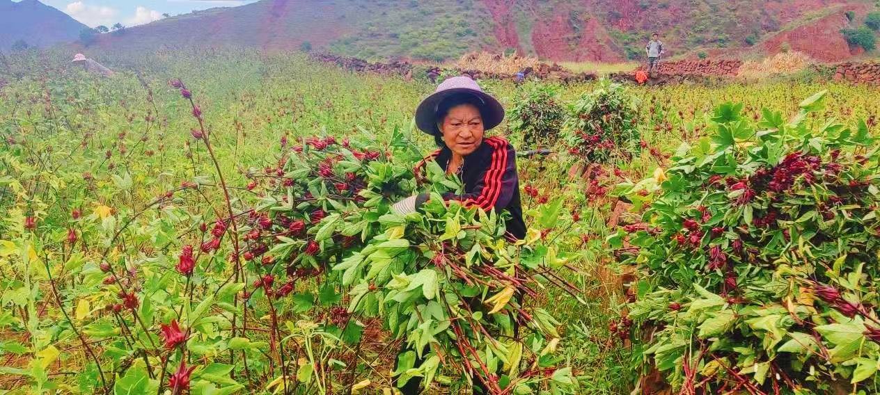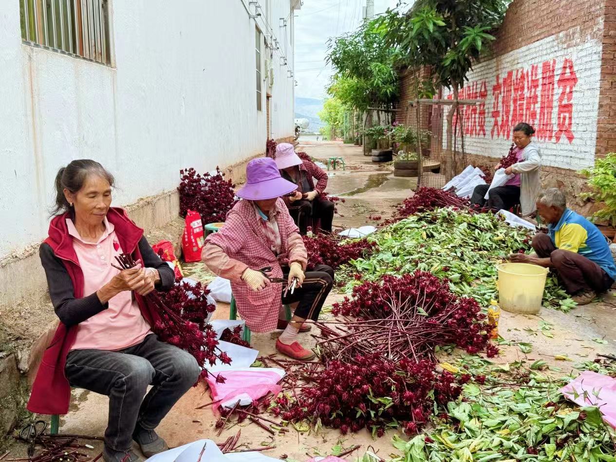 “玫瑰茄对土质要求不高,房前屋后,荒坡荒地都可以种,不打农药、无需施肥,只需间苗1次和除草2次就到收割季,管理简单,种植几乎没有成本。全村7个村组种植了300多亩,预计为群众带来150万元的收入。现在,种植玫瑰茄,已经成了我们村的特色产业。”以赤叨村党总支书记李德英说。
