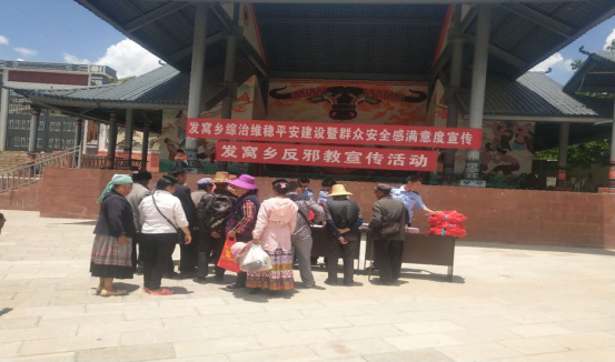为提高发窝乡干部群众的反邪教思想意识,近日,综治办、派出所、司法所三家单位联合,利用街天群众比较集中的优势,开展了反邪教宣传教育活动、平安建设暨群众安全感满意度宣传,积极营造平安稳定的社会发展环境。