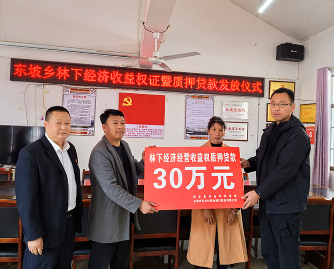 颁发仪式上,东坡傣族乡党委政府为以赤叨村委会致富带头人李文江和村委会副主任李永忠颁发了东坡乡首批林下经济经营收益权证,致富带头人李文江持经营收益权证在云南武定农村商业银行获得质押贷款30万元。