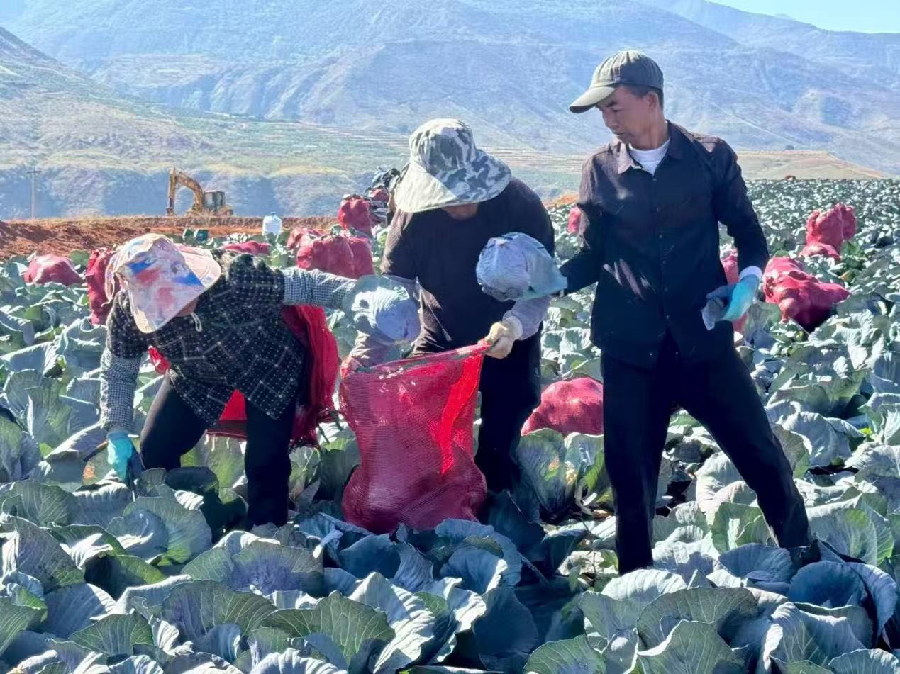 冬日时节,在东坡傣族乡白马口村委会红坪村民小组的千亩蔬菜种植基地里,一朵朵紫甘蓝格外引人注目,菜芯圆润饱满,像绽开的紫色“宝石”。工人们穿梭在田里,忙着砍菜、装袋,一袋袋新鲜的紫甘蓝正等着装车发往北京、上海、兰州、山东等地。