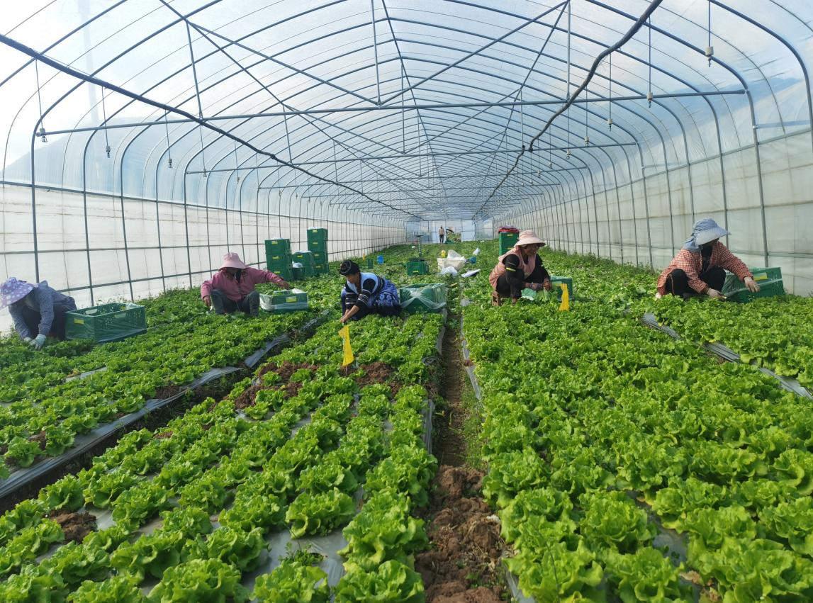 冬天,空气中透着丝丝凉意,在武定县插甸镇芸岭鲜生有机蔬菜基地里,一棵棵绿油油的生菜在温暖的大棚里显得格外生脆,几个来自附近的村民在精心采摘,旁边大棚里另一个组在给芹菜盖上膜,一百多村民在基地务工,一片繁忙的景象。