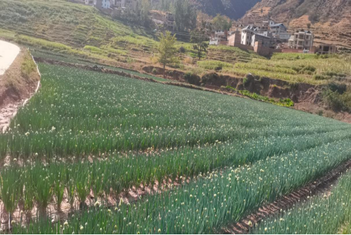 沿着小道继续往前,金色地毯被一条古桥横空斩断,桥的那头,是绿色的海洋。一排排荷兰豆和小香葱错落有致,老把村另一位村民文美荣的香葱制种地就在这里,与花菜制种不同,小香葱要求土壤湿润,但又不能积水,因此要在育苗阶段提前盖上薄膜。文美荣表示,香葱不喜高温,所以一般要在温度低、日照短的冬季完成育苗,来年开春便可收获,老把村是去年才开始发展小香葱制种,自己算是第一批带头人,按照收购商承诺,每亩产量约在100至120公斤,每公斤以50元进行收购,如果今年收成不错,相信很快便会在村里推广开来。