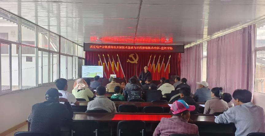 随后,岔河村委会组织开展了养鸡培训,邀请县农业农村局李永华老师到会指导。李老师详细讲解了武定壮鸡的养殖要点,耐心为农户答疑解惑,帮助农户掌握科学养殖技术,提升壮鸡养殖水平。