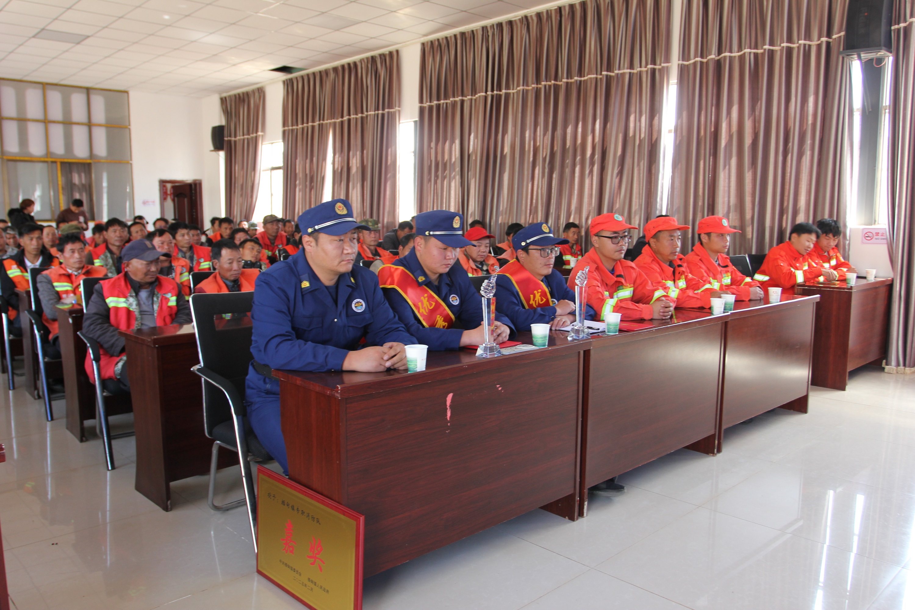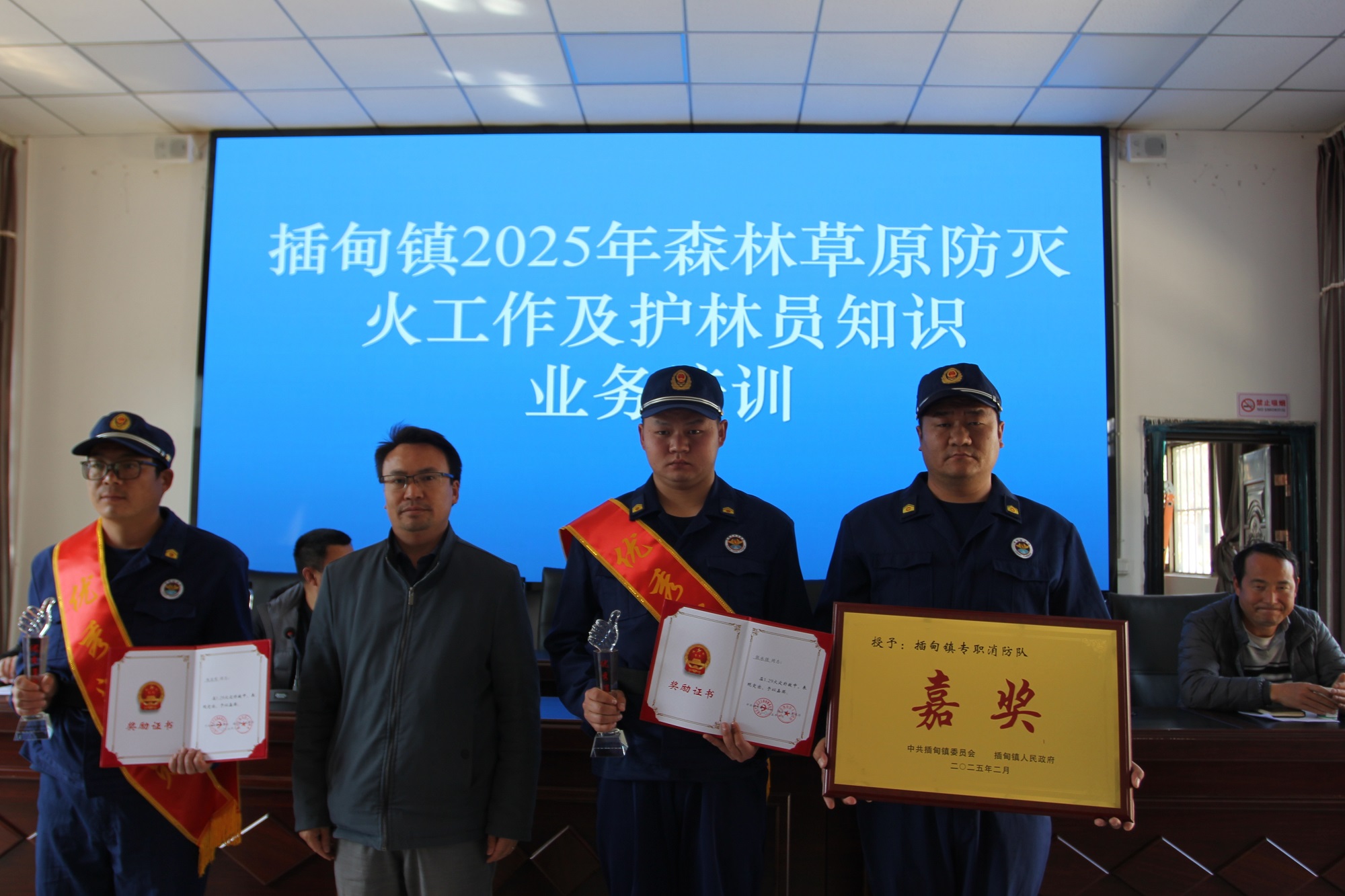 会前,插甸镇人民政府副镇长杨勇代表镇党委、政府宣读了对综合应急救援队队员陈亚军、张永强两位在1月29日春节值班期间突发民房火灾扑救中突出表现的表彰决定,并由镇党委副书记、镇长杨旭保为两位灭火工作先进个人颁发了奖状及纪念奖杯,为我镇防灭火工作树立了先进榜样。