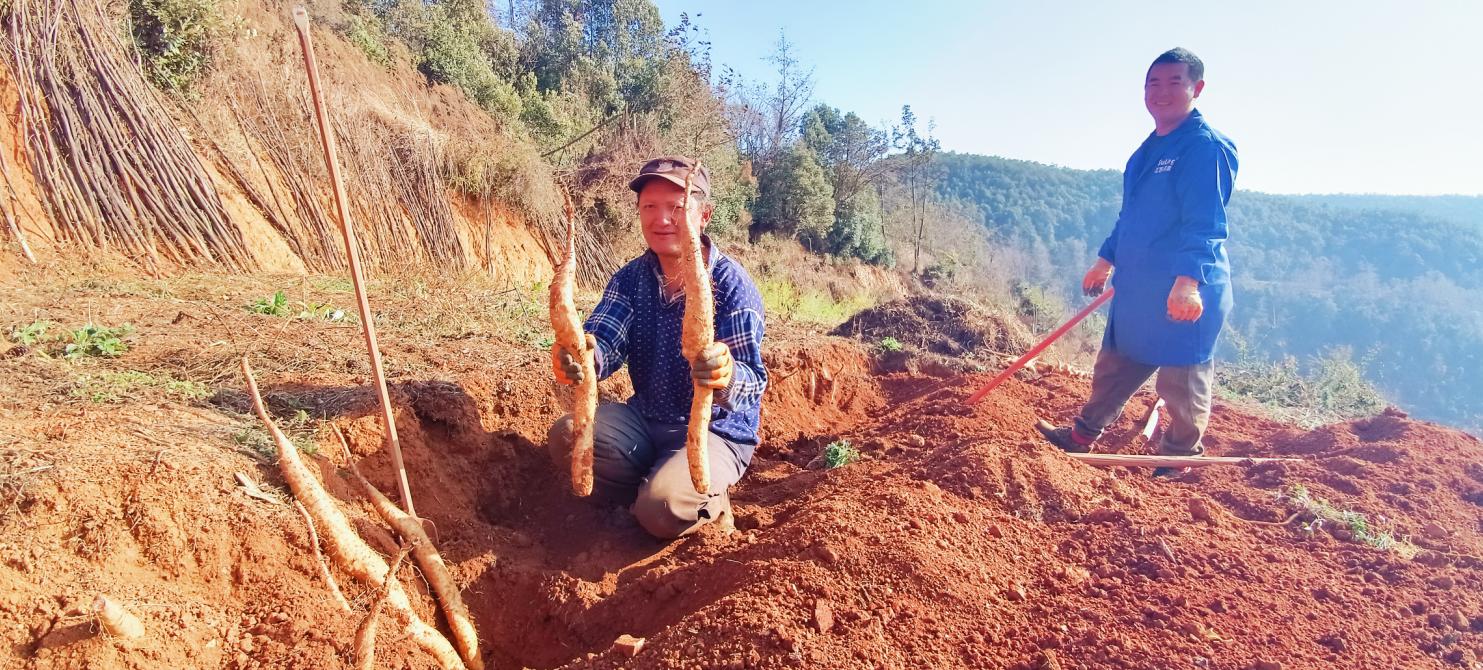 “近几年我发现山药销量很好,我就在本村委会包山地种植山药,2024年我种植了100余亩,种山药、管理山药、挖山药我都是找的本村的人,平时有四五个人跟我管理山药,挖山药工人最多时候是二十个。我家的山药大多数都是直供安宁等地,不愁售价和销路,今年我家收入可达15余万元。”插甸镇和尚庄村委会和尚庄村种植大户张学华心满意足地说道。张学华家的山药每年只种植一季就换地了,从8月份到第二年的1月份,在1月份山药挖完就把地还给村民尽快备耕,不耽误村民3月份种植苞谷,勤劳的村民在春节前就把地平整了种植上早洋芋,5月份洋芋丰收后又可以种植小春,还能实现一年收“两发”。自从张学华种植山药以来,和尚庄村民从在外务工实现了在家门口务工,张学华既能赚钱又能照顾本村村民务工,妇女同胞们跟着他赚钱都很开心。