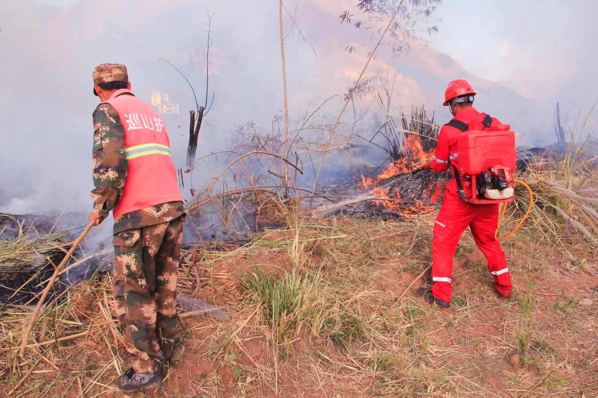 演练模拟所所卡村委会勐果村附近山林发生火情,护林员在发现火情后,立即疏散周围人员并上报乡森林草原防灭火指挥部,乡、村两级实地指挥,科学调度,迅速启动应急预案,指挥应急消防救援队赶赴火场,利用风力灭火机、高压水泵等设备组织扑灭火源,干部群众合力开辟防火隔离带,分工明确,协同作战。经过近30分钟的紧张扑救,火情被成功控制,明火被成功扑灭,同时对火场进行地毯式排查,确保没有余火复燃的可能,演练取得圆满成功。