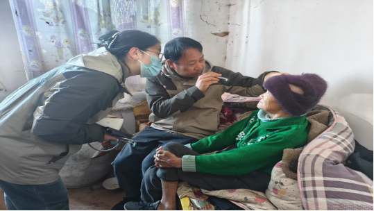 此次活动通过健康宣教、义诊服务、入户体检等多元化服务展开。在活动现场,医生向村民普及“健康素养66条”相关知识,并围绕“三减三健”、“慢性病防治”等主题进行了深入浅出的讲解,让晦涩难懂的医学知识变得通俗易懂。同时,医疗队为村民提供血压检测、心肺听诊、用药指导等义诊服务。村民纷纷表示:“以前去卫生院看病需要坐车,现在医生上门看病,实在太方便了!”对筛查出的慢性病患者,家庭医生将会进行持续跟踪管理。此外,为了让特殊群体享受到医疗服务,医疗队携带诊疗箱,深入特殊群体家中......在一位视力受损的老人家中,医生们为她进行全面的体检和健康评估,发现老人患有严重白内障,在了解到老人家庭经济困难后,医生们向她及家属介绍了相关医疗政策,以帮助其家庭减轻就医的经济压力,助力老人重见光明。