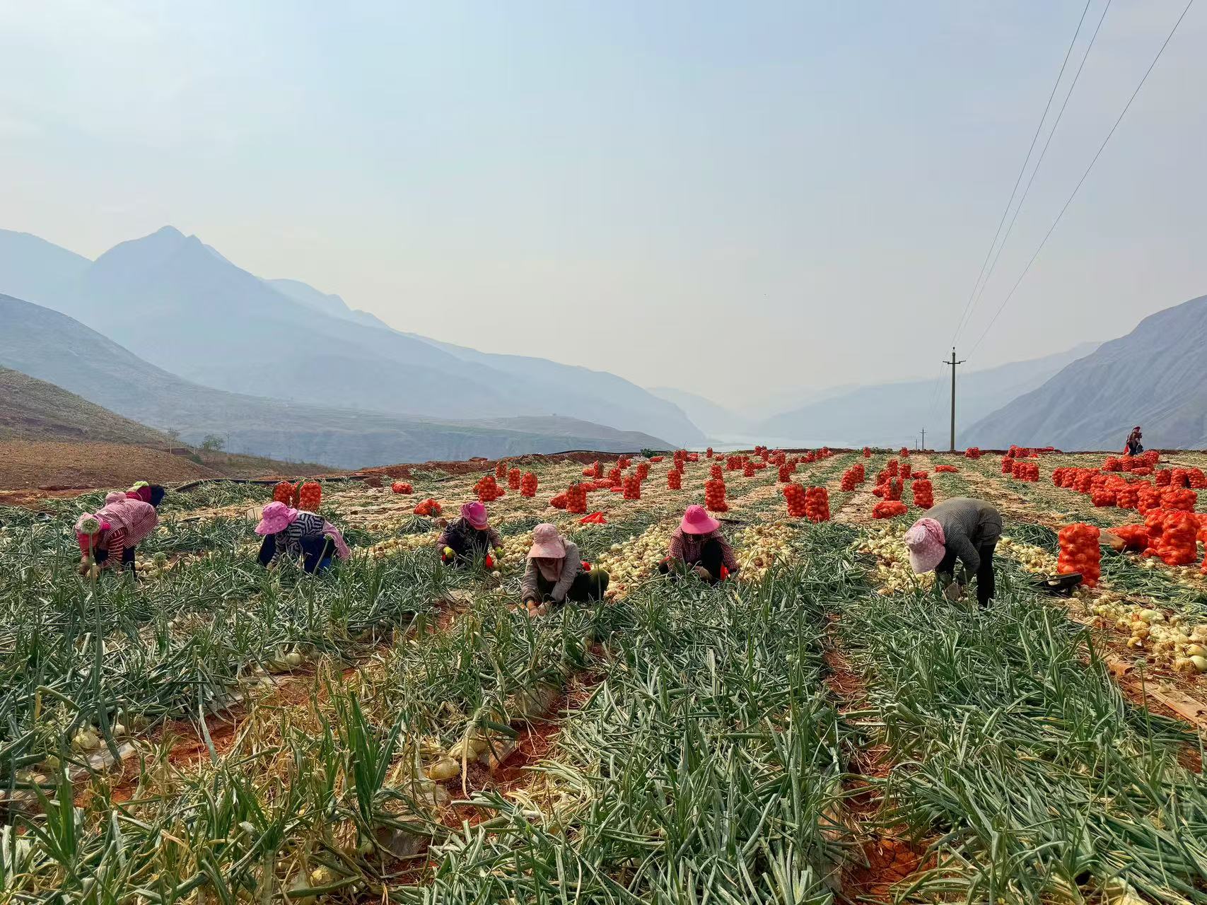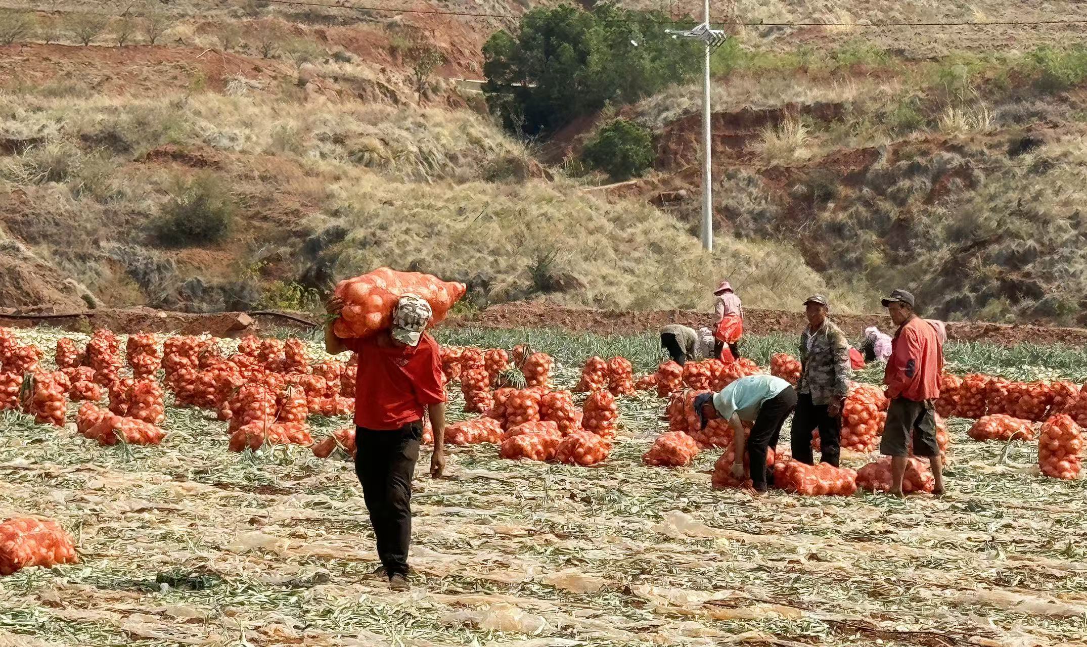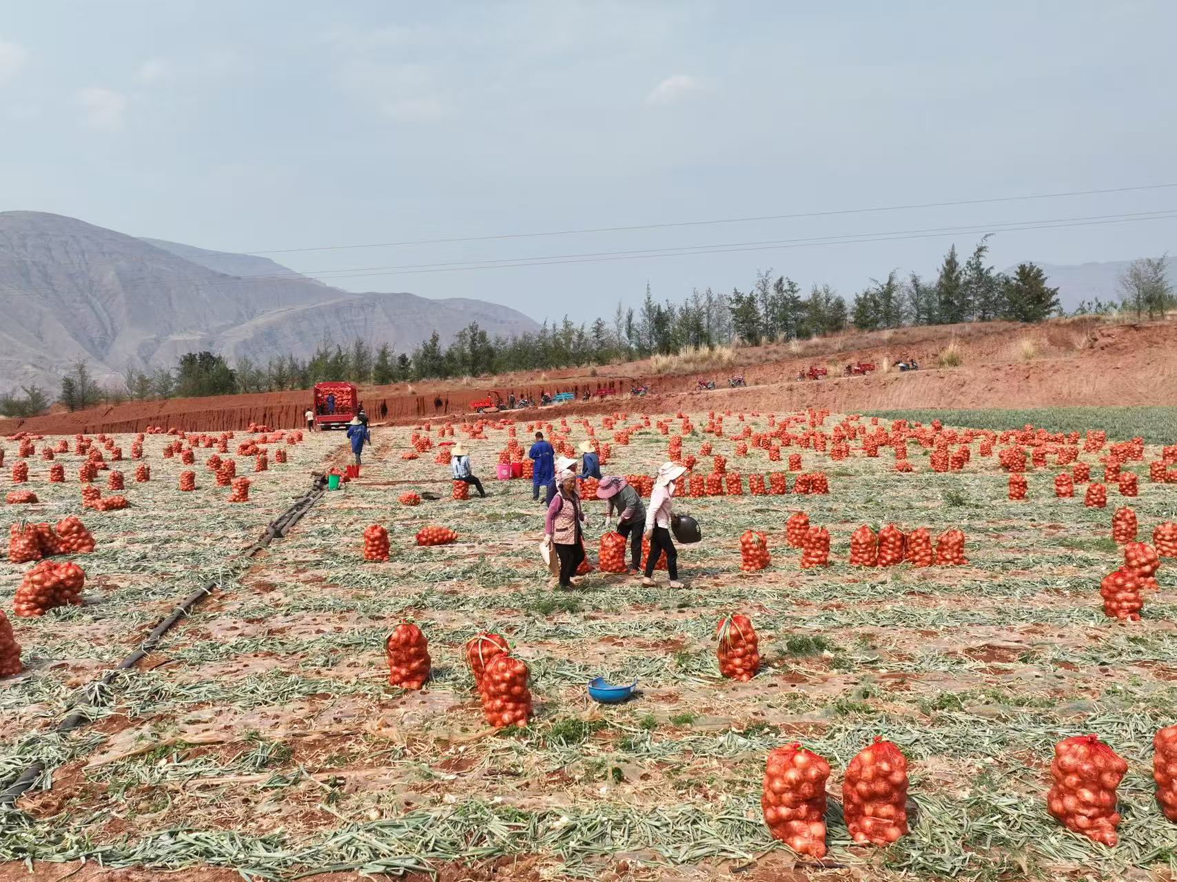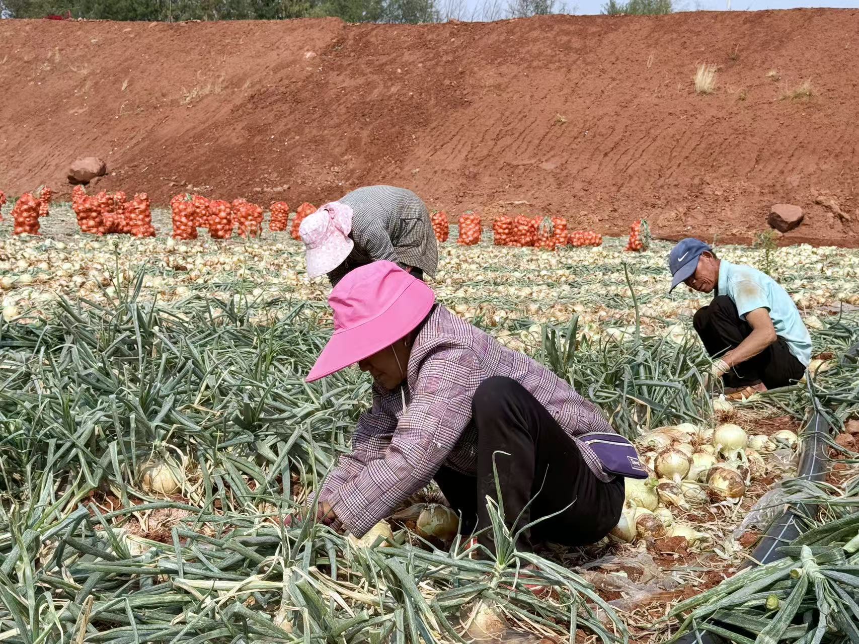 “我们根据市场需求,与经销商达成合作意向,今年种植了130亩洋葱,平均每亩产量可达7-8吨,预计产值在163-187万元。洋葱成熟后,以每吨1800元价格订购给客商,直接从地里采摘装车运往山东青岛,加工完毕后,坐上渡轮出口到韩国和日本。”基地负责人杨明学说道,“洋葱在育苗、覆膜、种植、除草、管理、收获等不同环节,都需要投入大量人工,现在洋葱进入收获期,吸引了周边大量群众前来务工,一天最多的时候有80多个工人。”