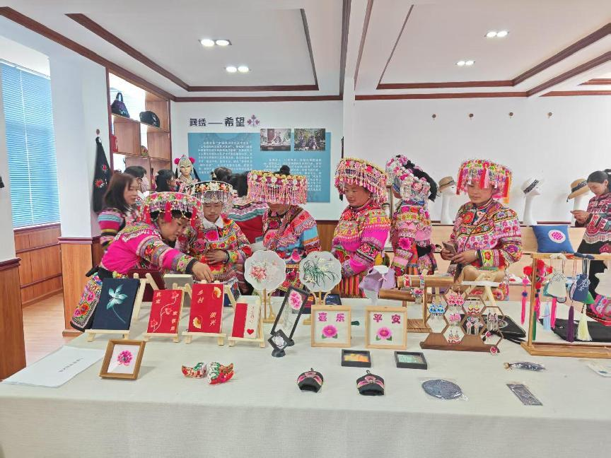 培训现场,通过丝巾、围巾、扇子、公文包、手提包、胸针等文创产品的展示,让越来越多的绣娘了解到除了传统彝族服饰,如何将彝绣文化与日常生活相结合,设计出更受市场欢迎的文创产品。同时通过讲解传统服饰与新概念彝绣服饰的设计区别,在丰富绣娘技艺的同时,拓宽设计思路,鼓励她们大胆尝试,不断创作出更加优秀的彝绣作品。