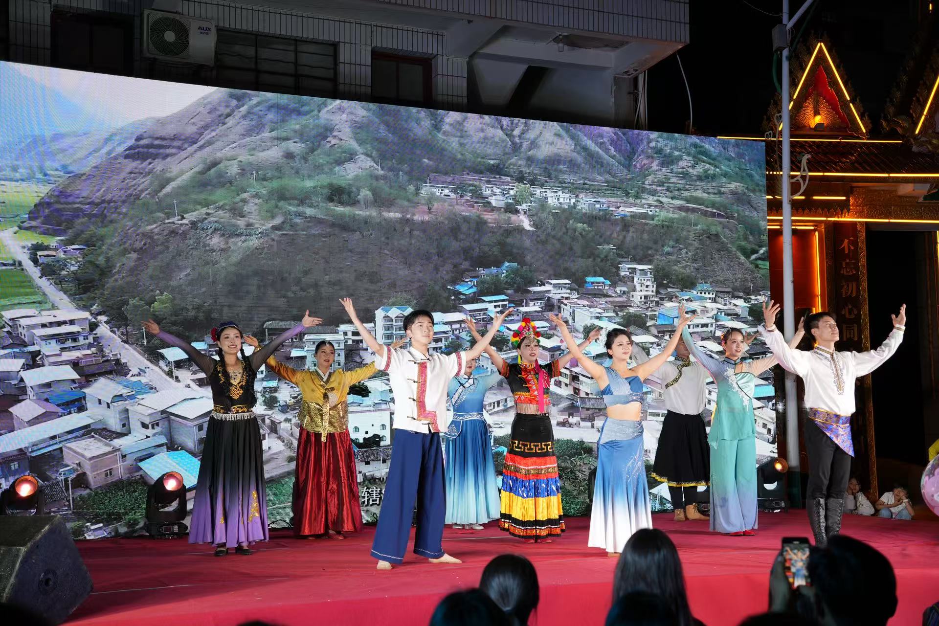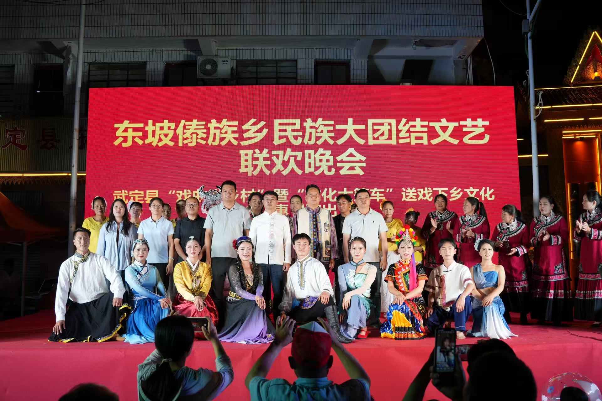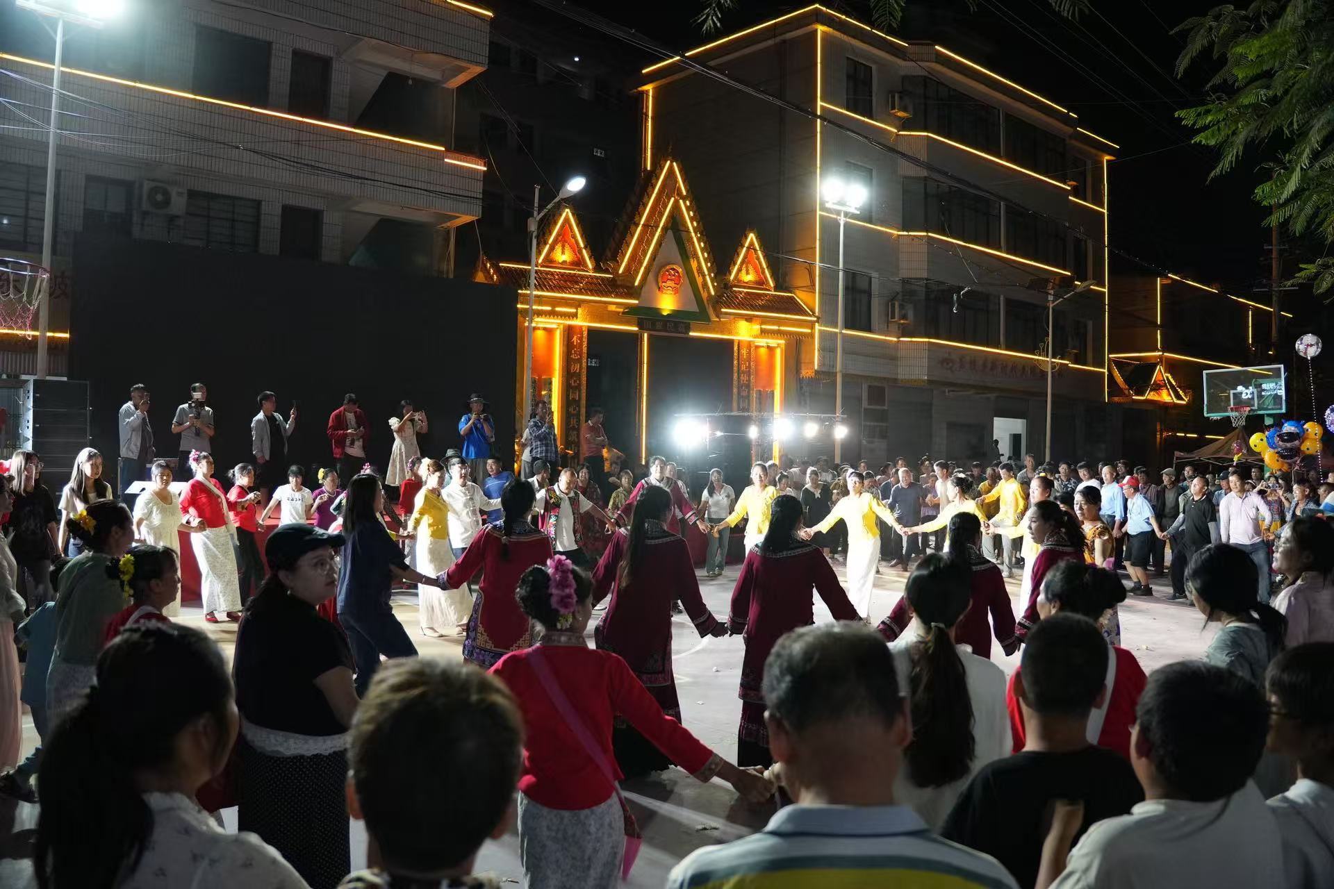 夜幕降临,联欢晚会在璀璨灯光中开场。演员们献上《泼水欢歌》《相约东坡》《竹林恋》等歌舞用优美的舞姿和歌声展现出傣族人民的勤劳、勇敢和智慧,绘就了一幅民族团结的动人画卷,随后,各族群众手拉手,在欢快悠扬的歌声中跳起了节奏明快的传统跌脚舞。