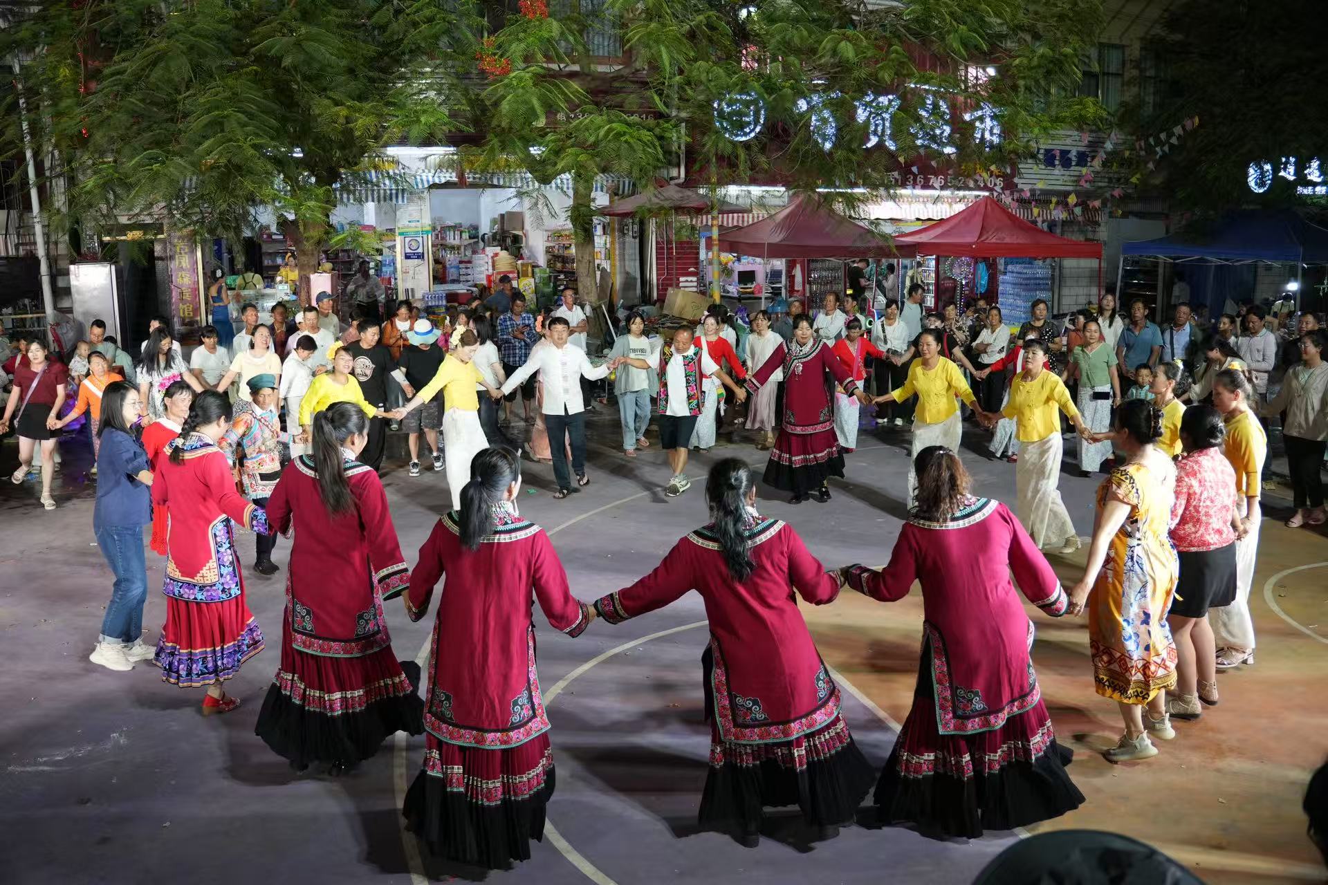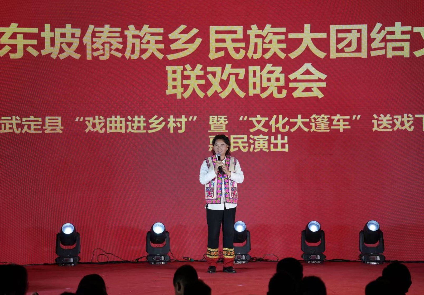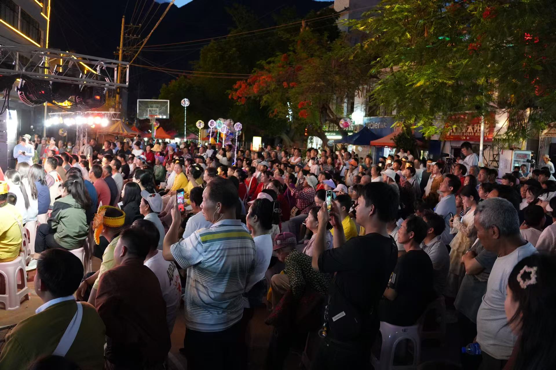 夜幕降临,联欢晚会在璀璨灯光中开场。演员们献上《泼水欢歌》《相约东坡》《竹林恋》等歌舞用优美的舞姿和歌声展现出傣族人民的勤劳、勇敢和智慧,绘就了一幅民族团结的动人画卷,随后,各族群众手拉手,在欢快悠扬的歌声中跳起了节奏明快的传统跌脚舞。