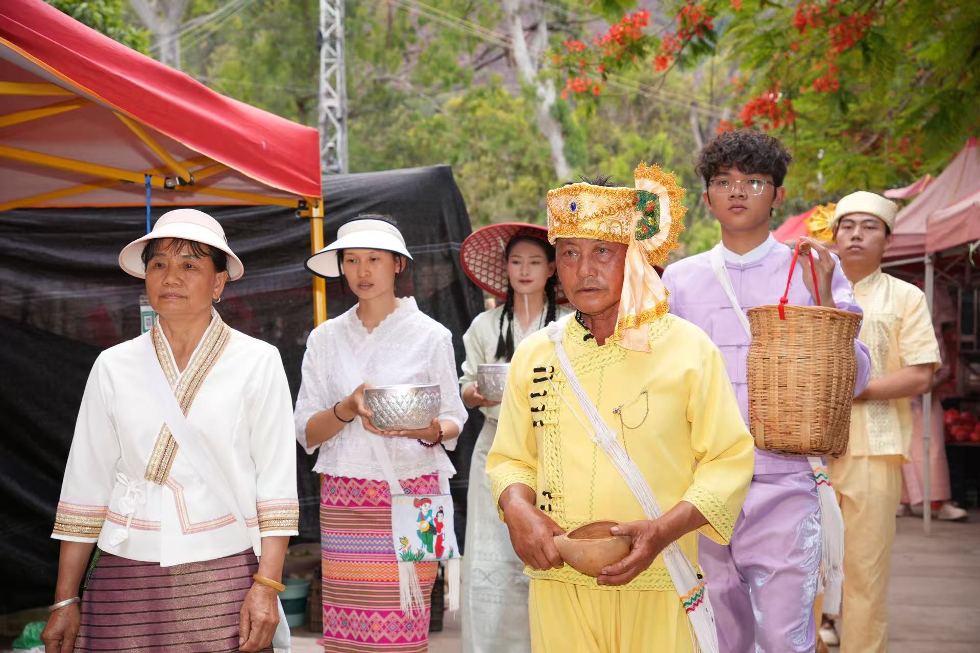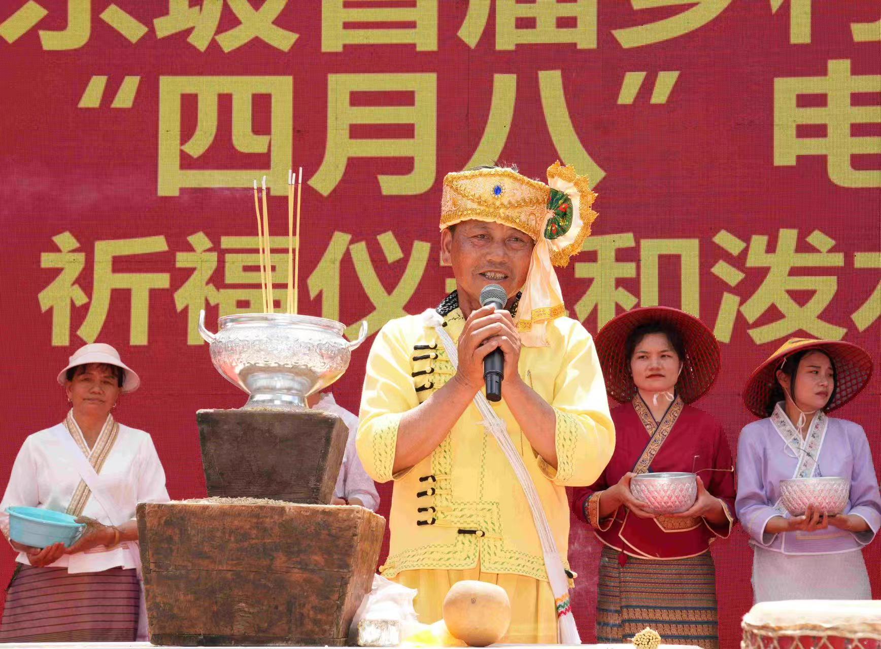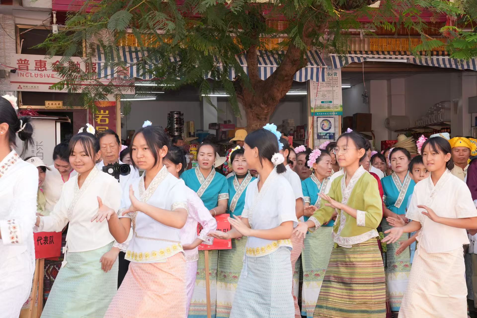 下午,身着节日盛装的傣族群众齐聚集镇广场举行了古老而庄严的祈福仪式,现场祈愿声、铓锣声与象脚鼓声交织,人们沐浴在用柳枝撒下的“圣水”下祈愿风调雨顺、五谷丰登。随后,傣族青年男女纷纷跳起噶光舞,表达对自然的敬畏与感恩,对幸福生活的期盼。