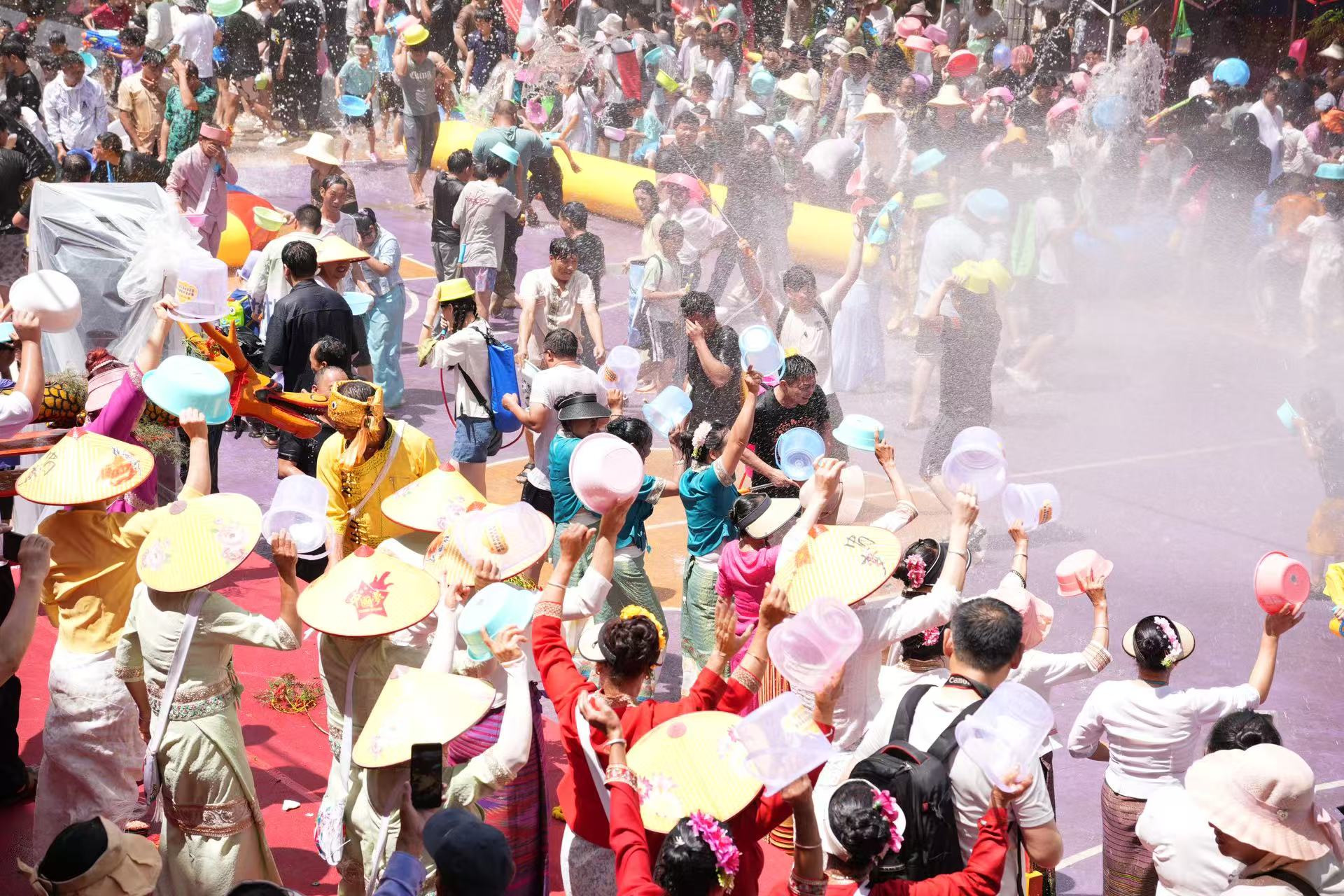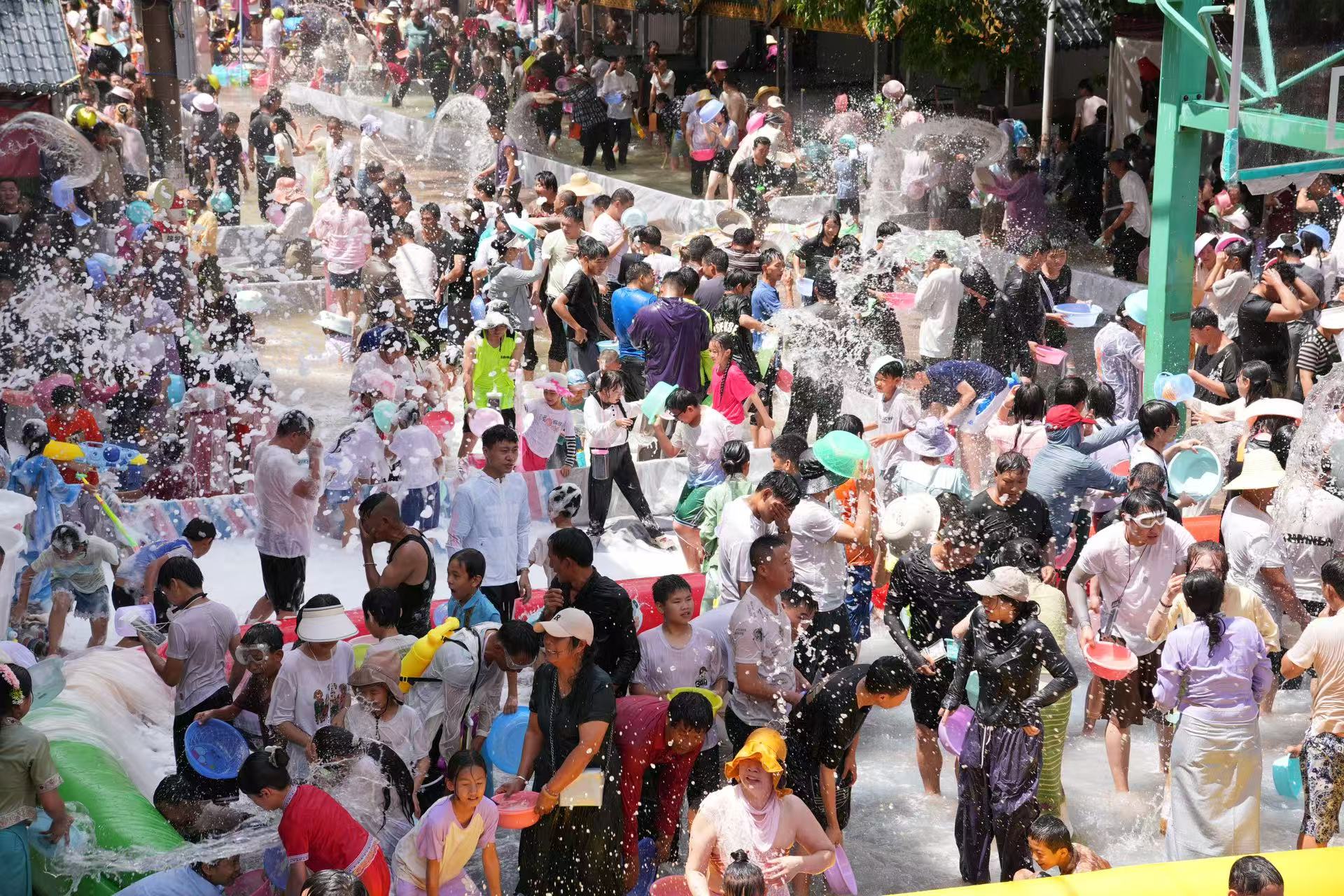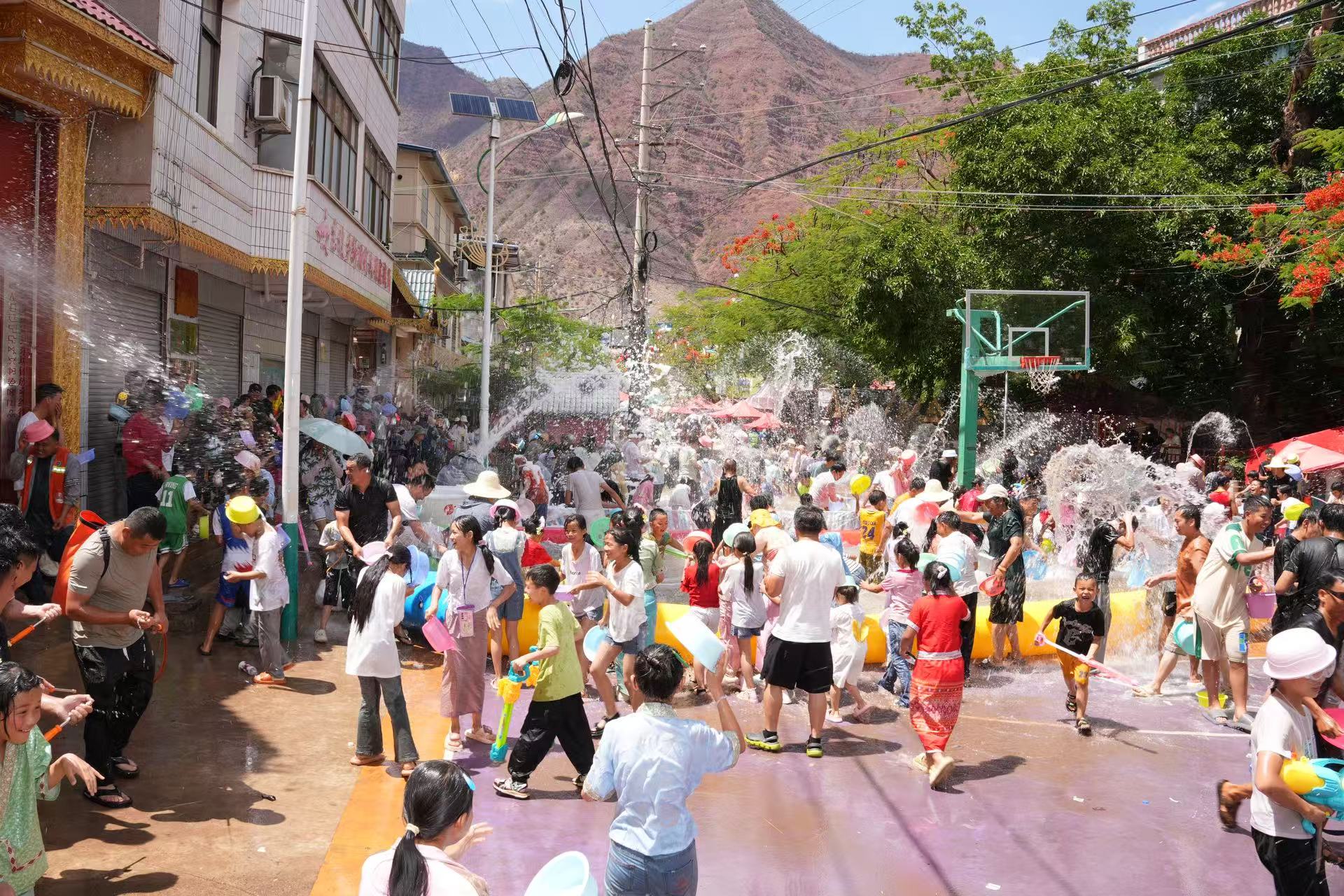 随着祈福仪式结束,泼水狂欢正式拉开帷幕。主会场上,游客与当地群众手持水盆、水枪,以清水为媒互相祝福。孩子们追逐嬉戏,年轻人载歌载舞,银铃般的笑声与飞溅的水花交织成欢乐的海洋。身着筒裙的傣家姑娘成为镜头焦点,她们以轻盈的舞姿诠释着“水一样的民族”的灵动之美,现场气氛持续高涨,欢呼声此起彼伏。