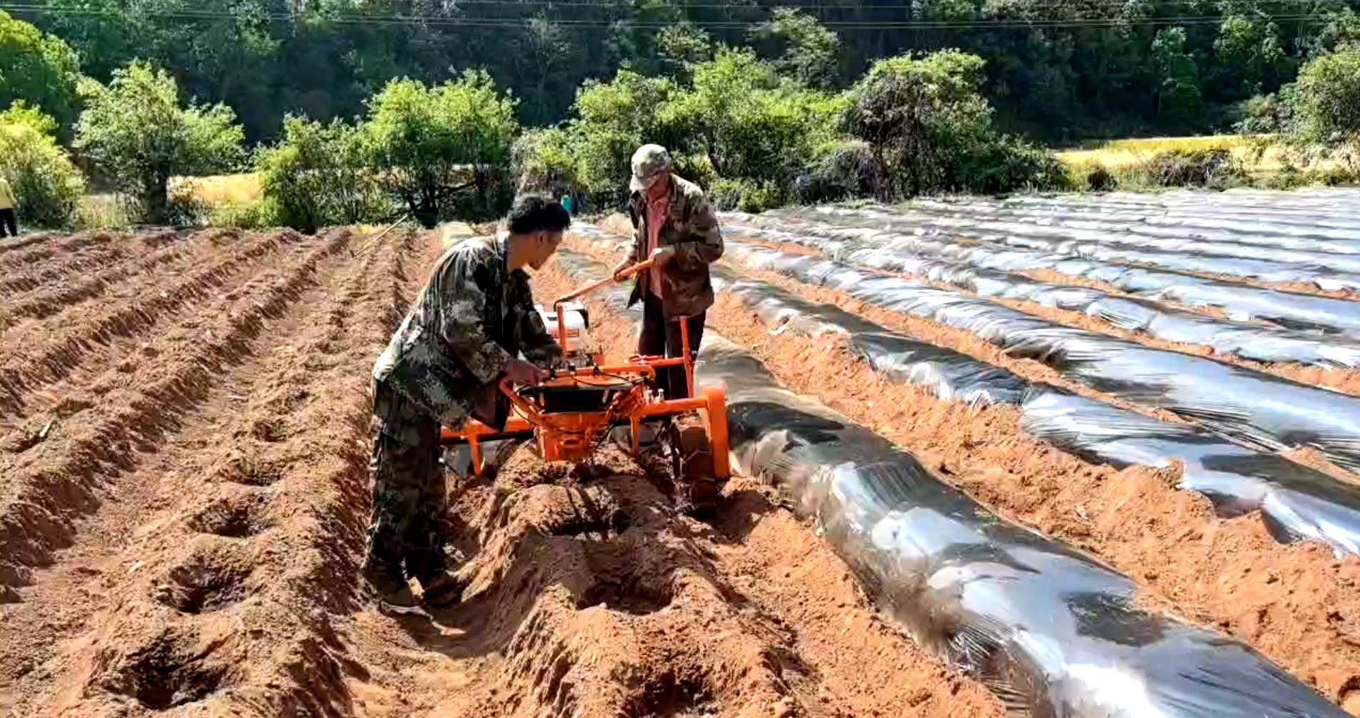 种植大户李文富的49.6亩烟田里,覆膜机穿梭往返覆膜,精准笔直的地膜在阳光下熠熠生辉。几名烟农手持移栽工具,紧跟机械步伐,利落地在膜上打孔、栽苗、浇水。“这覆膜机效率真高,不仅覆膜又快又平整,还能同时起垄,省了不少人力!”李文富蹲下身仔细查看新栽烟苗的间距,笑着对技术员竖起大拇指,“多亏你们推广的机械化种植,现在一天能完成十多亩移栽,比往年快了近两倍!”