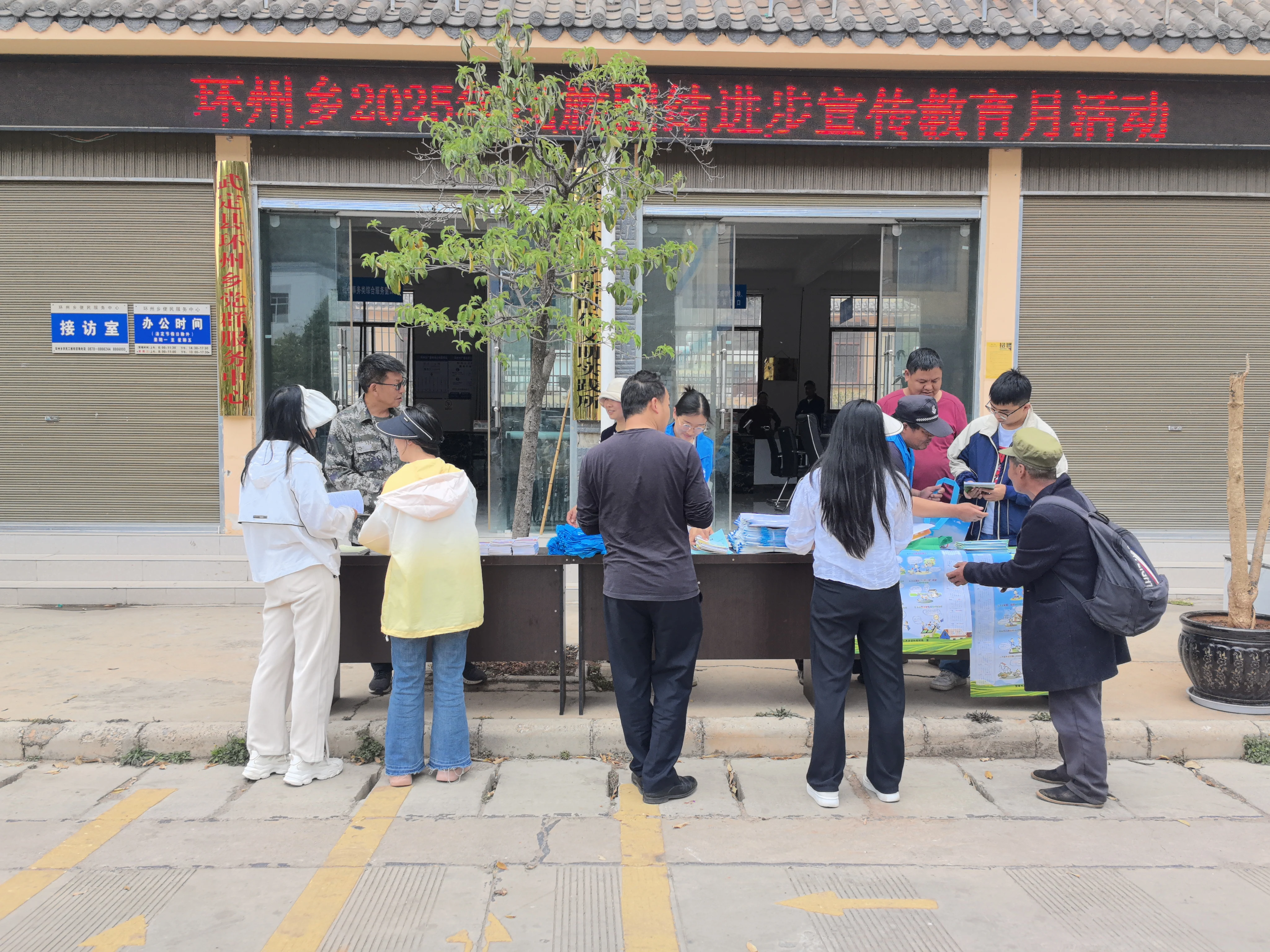 “流动课堂”接地气。工作人员在集镇主干道设立宣传展台,悬挂“环州乡2025年民族团结进步宣传教育月活动”横幅,向赶集群众发放《云南省民族团结进步示范区建设条例》、《铸牢中华民族共同体意识应知应会手册》、《宗教事务条例》、《云南省宗教事务条例》等宣传手册300余份,用通俗语言讲解“三个离不开”“五个认同”等核心内容。