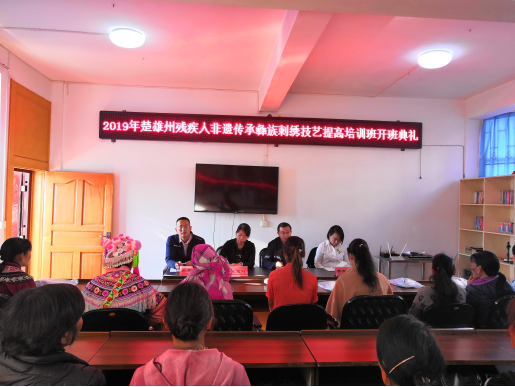 参加上午培训班开班仪式有州残联王玉红主任,县残联张学晖副理事长,镇人民政府许建波镇长。开班仪式上镇人民政府许建波镇长做开班动员讲话,他向学员们提出:一要发挥猫街彝绣产品的特色,提高彝绣产品的档次和品质上下功夫,以就地就业的方式,发展订单式彝绣产品经营模式,促进残疾人增收脱贫;二要在彝绣产品市场营销上,推动“互联网+”以扩大销售市场,以彝绣产业助脱贫;三要学员要勤思考、多观察,多交流、善沟通,努力学到真本领,发扬传统彝绣技艺,将“非遗传承+文化扶贫”模式发挥得越来越好,立足做活合作社,把小产品做成大产业,助推残疾人脱贫致富,实现文化助脱贫。