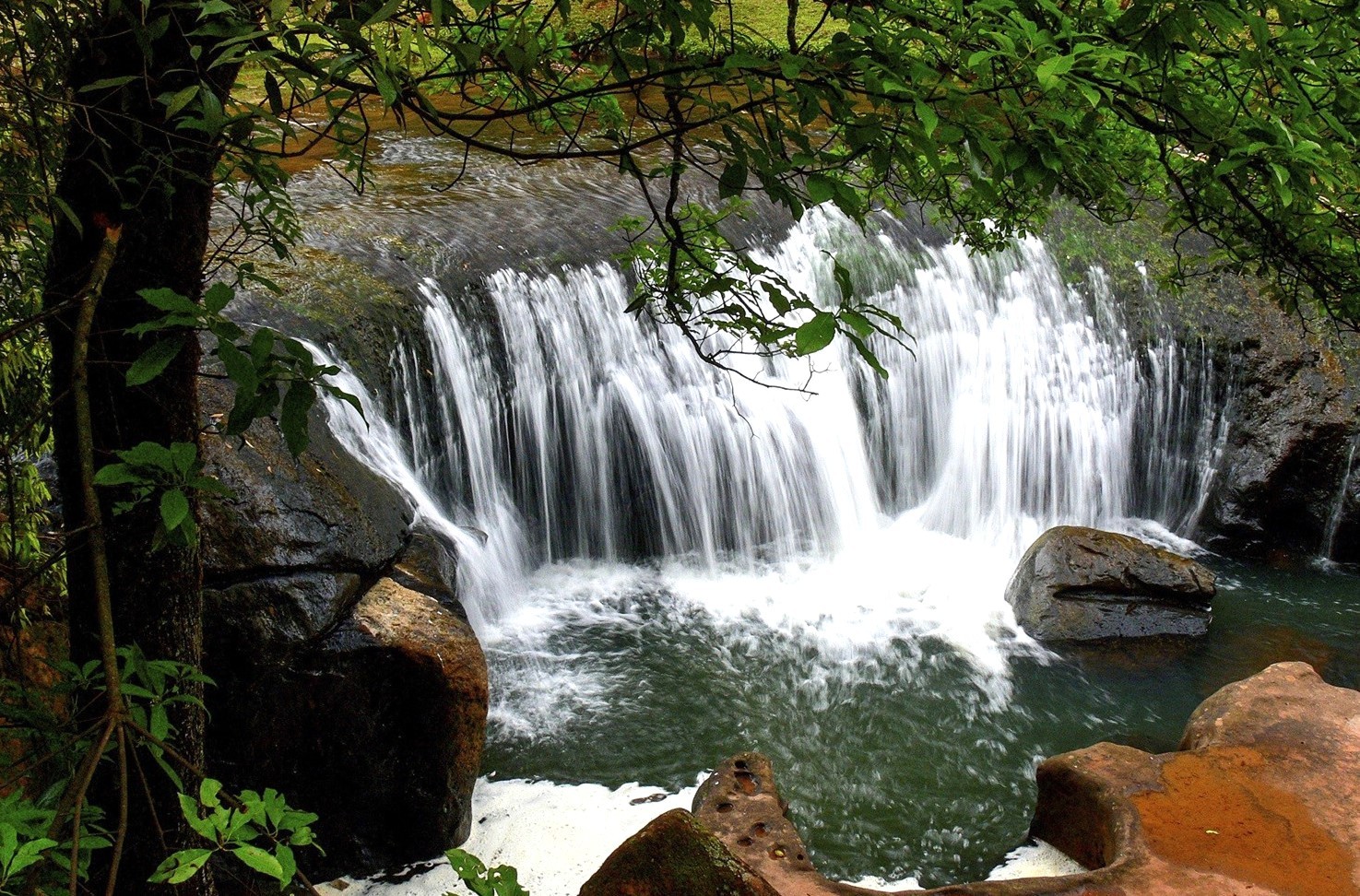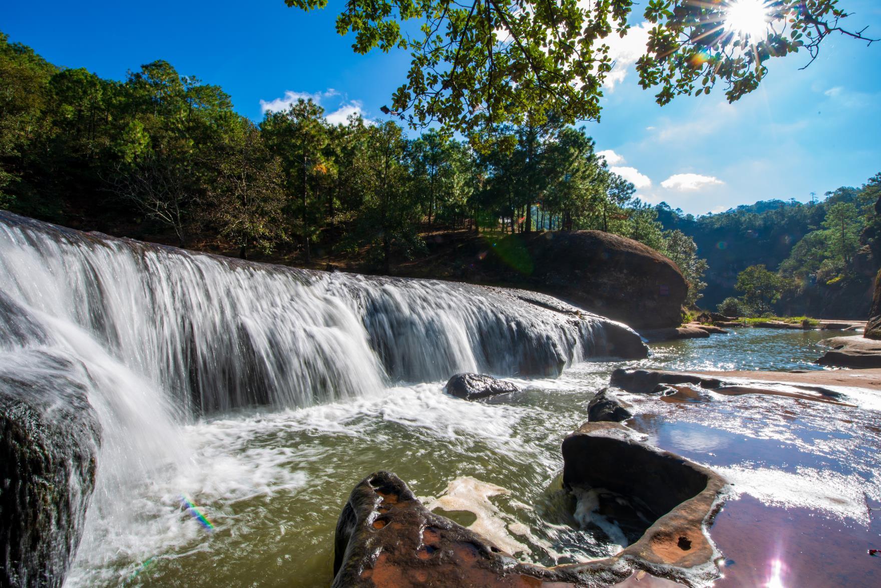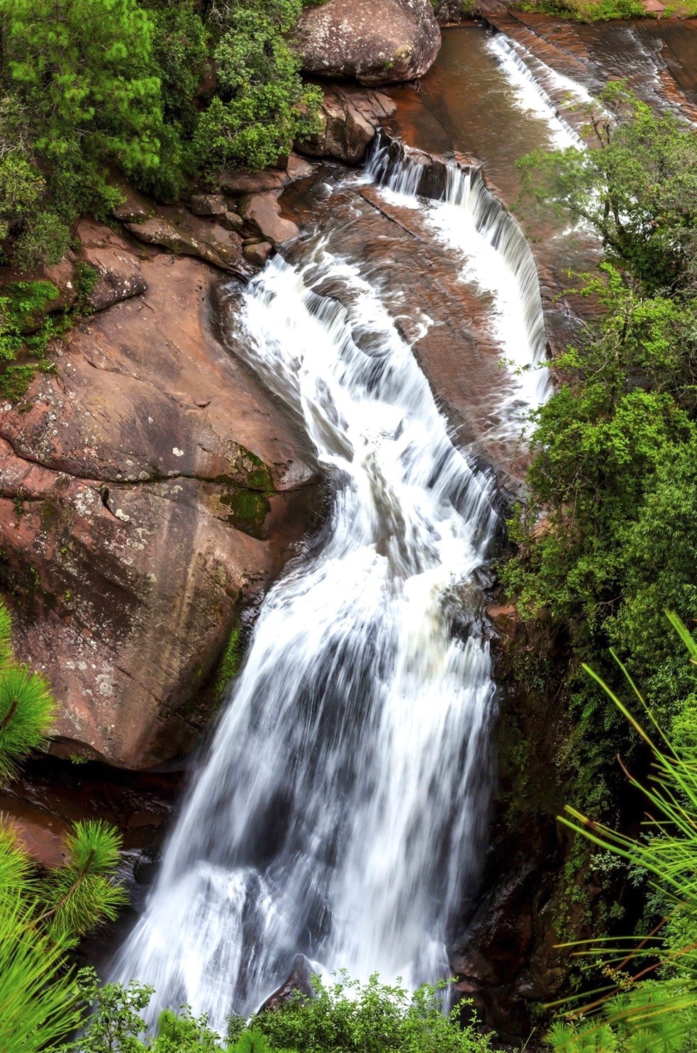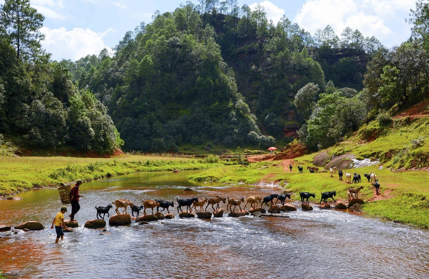 水城河位于武定县插甸镇水城村,流域范围内植被茂密,生态环境良好,当地人称水城河是“头戴绿草帽、中间石肚翘、脚下清泉流”的绝美山水风光旅游地。大自然的天工之作,造就了水城河数道不同类型的瀑布,河床两岸巨大奇特的红砂岩与原生植被交融一体,形成亮丽景观。清澈的河水在宽阔而坚硬的河床上静静地流淌,既有高原湖泊的明净,也有深谷飞瀑的壮美。沿着水城河一路前行,便能邂逅绝美的山水画卷,有溪流瀑布欢唱,高原平湖静思,云雾高山缠绕,巨石险壑耸立,深谷村落悠然。图为水城河瀑布。盛高义 摄