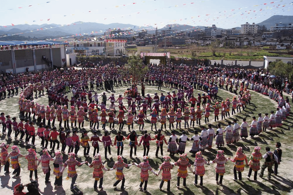 其特色舞蹈要数跌脚舞,每逢节日或娶媳嫁女的喜庆日子,在村落集中的地方,只要笛子、三弦一响,无须召唤,人们就会随之起舞,舞者不限,少则十几人,多则几十、几百、甚至上千人。跌脚的时候,人们围着篝火,手拉手围成一个大圈,男的或弹弦子,或吹竹笛,女的歌唱,有节奏的运步跌脚,参舞者有小至七八岁的儿童,老到年逾花甲的长者,有的年轻父母甚至背着小孩上场,到了这种场合,真可谓“笛子响,脚板痒”。跌脚舞分“一边一脚”至“十二脚”,“单穿花”至“八脚穿花”,以及“公鸡啄架”、“马四蹄”、“赶跌”、“转跌”、“背靠跌”、“交叉跌”等20多种套路,加上笛子、小三弦等伴奏,显得活泼热情,粗犷豪放,深受各族群众的喜爱。