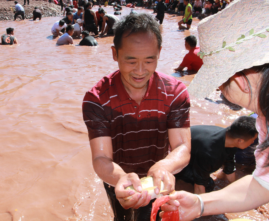 捉鱼比赛环节,游客朋友及孩子们纷纷撩起袖子、卷起裤腿,跳入水塘徒手捉鱼,岸边的亲友团有的呐喊助威,有的支招,好不热闹。“抓到了,抓到了!”一位男游客逮着机会便俯身抓到一条大鱼,一脸的兴奋之情。活动现场吸引了数千名游客到场围观,欢呼雀跃,到处都充满了欢声笑语,通过“浑水”摸鱼比赛,获得了“回归大自然,亲近大自然”的美好体验,让成年人回味儿时摸鱼的快乐时光,让青少年感受“融入大自然、徒手摸鱼”的无穷乐趣。