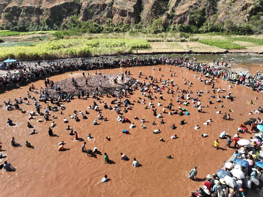 1月23日,勐果河谷阳光明媚,春意盎然。缠绵悠扬的傣族歌谣,轻盈柔美的傣族舞蹈,宏壮深沉的象脚鼓声,清脆悦耳的排锣鼓声,河水中摸到鱼的叫喊声,鱼儿从手中逃脱的笑声,河岸上围得水泄不通观看摸鱼的欢呼声,交相辉映,响天震地,这就是勐果村大年初二一年一度的勐傣奥巴节活动现场。