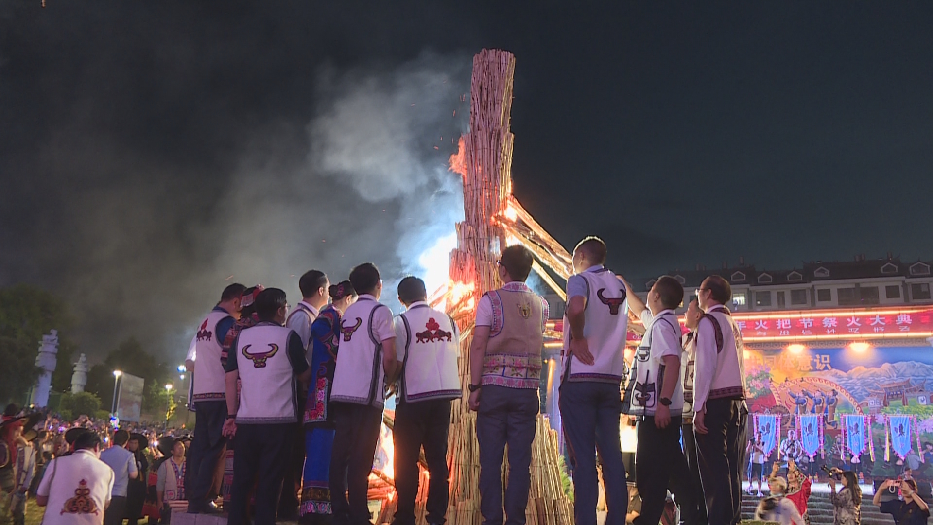 祭火仪式结束后,县委书记罗如贵,县委副书记、县长沈海燕,县委副书记黄飞,县人大常委会主任普正祥,县政协主席周廷质等县四班子领导手持火把,走向广场中央,共同点燃了象征希望和祝福的主火把,熊熊的火焰映红了夜空,预示着武定更加团结和谐,更加繁荣昌盛。随后,广场上空焰火礼花齐放,天空顿时五彩缤纷,耀眼的亮光照亮整个夜空。地上笛声悠扬,令人欢呼不已,整个体育广场歌舞飞扬,县四班子领导与全县各族干部群众和外地宾客一同跌脚、撒火把、忘情狂欢,共同庆祝火把节。