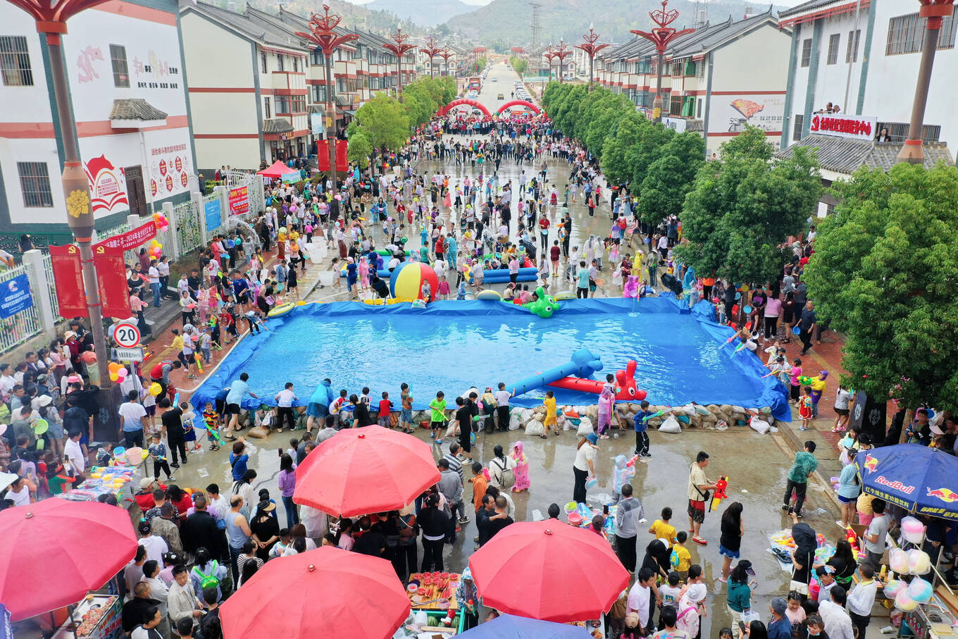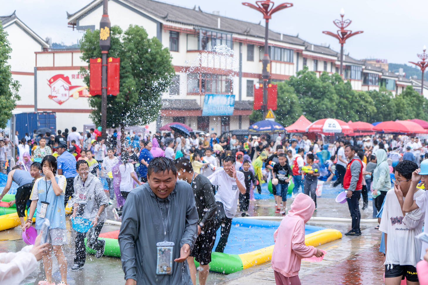 5月12日,狮山镇金沙社区水花飞舞、激情似火,来自四面八方的游客与社区群众一起,相互泼洒吉祥、幸福之水,表达美好祝福和期望。