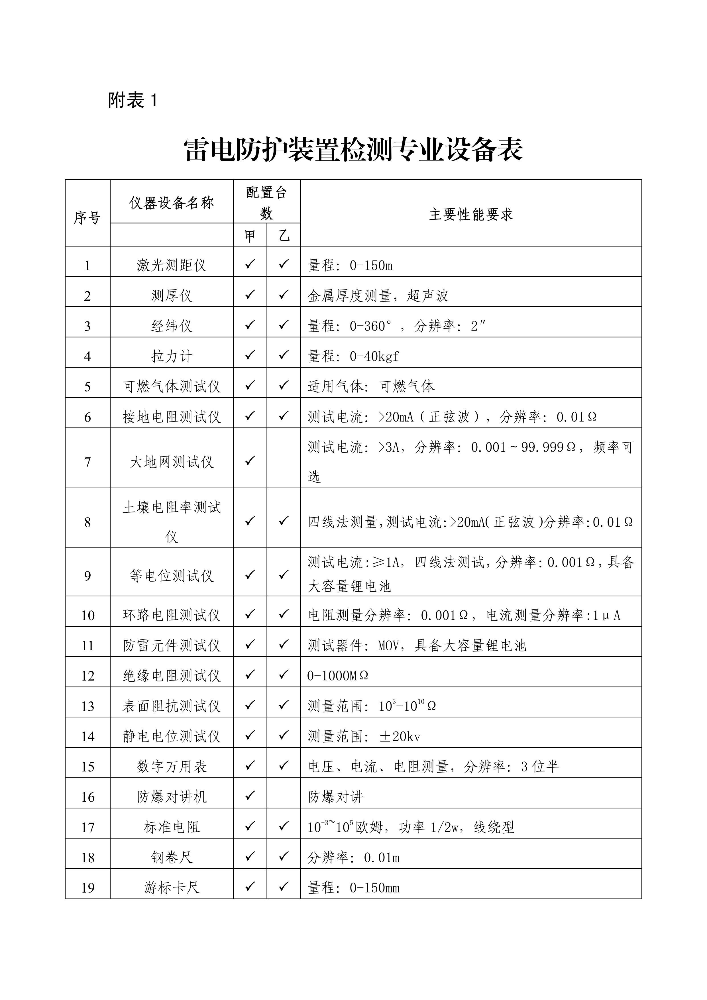 (一)具备雷电防护装置检测能力的人员,其中具有高级技术职称的不少于一名,具有中级技术职称的不少于三名;技术负责人应当具有高级技术职称,从事雷电防护装置设计、施工、检测等工作两年以上,并具备乙级资质等级要求的雷电防护装置检测专业知识和能力;