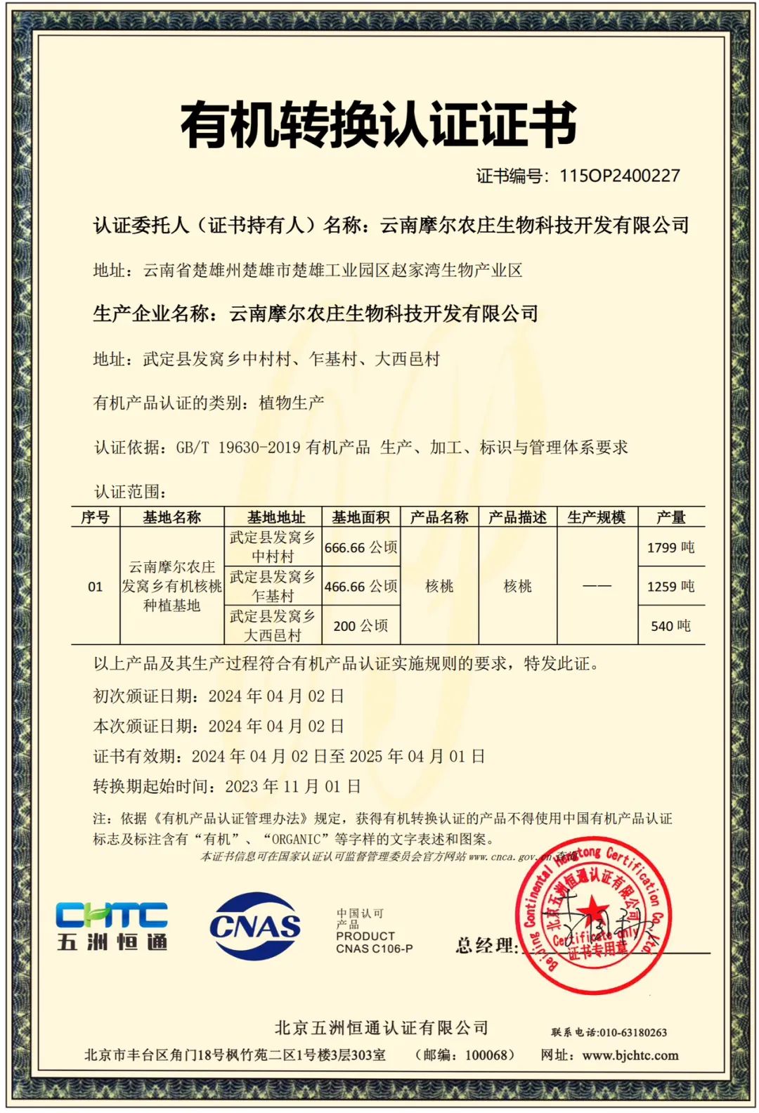 阳春三月,正是核桃树开花的时节,发窝乡传来一条喜讯。近日,位于发窝乡中村村、乍基村、大西邑村的云南摩尔农庄发窝乡有机核桃种植基地顺利通过有机认证程序,获得有机转换认证证书。本次认证核桃种植基地1333.32公顷,年产量3598吨。农产品有机转换认证证书的取得,标志着发窝乡核桃正式走上了有机产品之路,将助推全乡核桃产业发展迈上新台阶,也将为产业振兴打下坚实的基础。