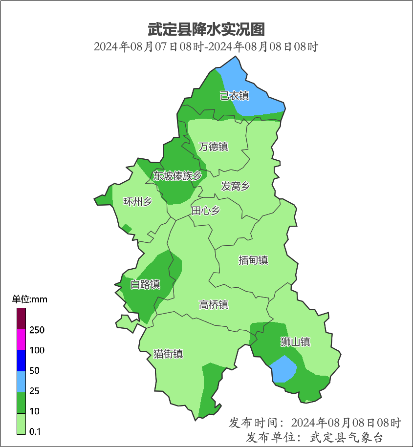 2024年8月7日08时至8月8日08时,我县普降小到中雨,统计全县27个自动气象站资料,全县平均降雨10.0毫米,其中10.0毫米以下17站,10.0~25.0毫米8站,25.0~50.0毫米2站,最大降雨量出现在已衣镇45毫米。各乡(镇)降雨量(毫米):狮山6.6、高桥6.7、猫街1.6、插甸0.4、白路11.3、环州4.6、田心2.3、东坡23.7、发窝3.9、万德6.4、己衣45.0。