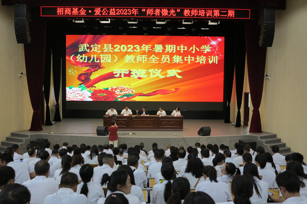 8月14日至18日,武定县组织开展招商基金•爱公益“师者微光”教师培训项目—2023年暑期中小学(幼儿园)教师全员集中培训。该项目由招商基金出资40万元,全国中小学教师继续教育网昆明办事处负责实施,武定县教育体育局具体组织承办。8月14日上午在武定香水中学报告厅举行了开班仪式,县教育工委书记、教育体育局党组书记、局长何毓才及班子成员参加了开班仪式。在开班仪式上,何局长从坚定教育信心和唤醒教育情怀两个方面做了动员讲话,他强调教师要以积极向上的心态去面对工作,要不忘初心坚定教育信念,要唤醒教育情怀,家国情怀,同舟共济抓好教育。全县中小学校长、教务主任、班主任700多人参加了开班仪式。全县2500余名教师分19个班级分别在职业高级中学、香水中学、思源实验学校、近城小学进行培训。