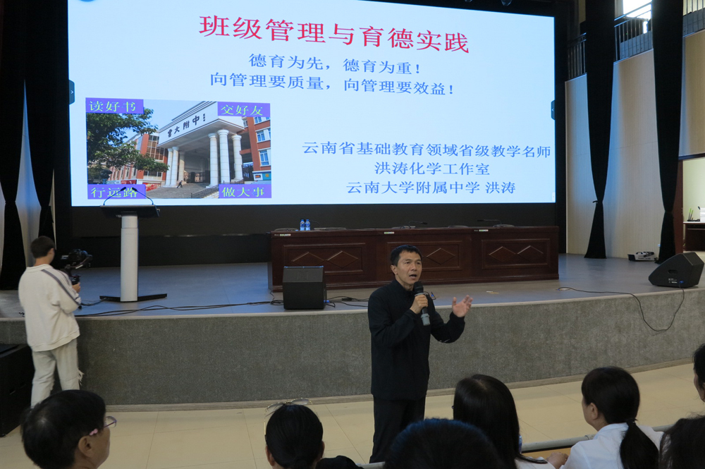 在“班主任培训班”上,云南省基础教育领域省级教学名师洪涛开展了《班级管理与育德实践》为主题的专题讲座。洪老师紧紧围绕中国学生发展的核心素养向教师们讲授了班级管理的思路、方法两大内容,结合案例细谈了构建育人体系,为谁培养人?培养什么人?怎样培养人?分享了班级管理的方法。昆明五华区名班主任工作室昆一中谢梅老师以《五育融合,促进班级建设,共筑精神家园》为主题的精彩讲座。教育体育局教研室华俊昌主任做了《以学为主有效课堂》专题讲座。讲座结合武定县基础教育的现状,围绕以学为主有效课堂的核心理念,从教学目标、教学过程、教学范式等进行阐述,让教师们对教学各个环节有了更多的了解,也为自己的课堂教学找到了努力的方向。
