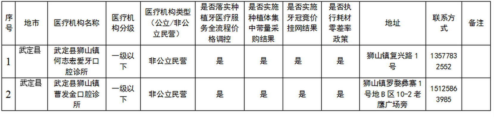 为满足群众种植牙需求,改善口腔健康,保障人民群众获得高质量、能负担的缺牙修复服务,医疗保障部门开展口腔种植收费专项治理,实施全流程口腔种植医疗服务价格调控、种植体集采、牙冠竞价挂网三项措施,总的目标是让耗材回归产品价值本身,让技术劳务价值得到合理体现,让医疗回归治病救人本质,促进种植牙行业健康可持续发展。我州开展种植牙医疗机构响应号召积极参与专项治理,主动承诺对标口腔种植医疗服务全流程价格目标调控的各项要求,参加种植体集中带量采购,规范收费行为,实行医疗服务、种植体、牙冠分开收费,明码标价,自觉接受广大患者的监督,现将参与治理的医疗机构名单公布如下: